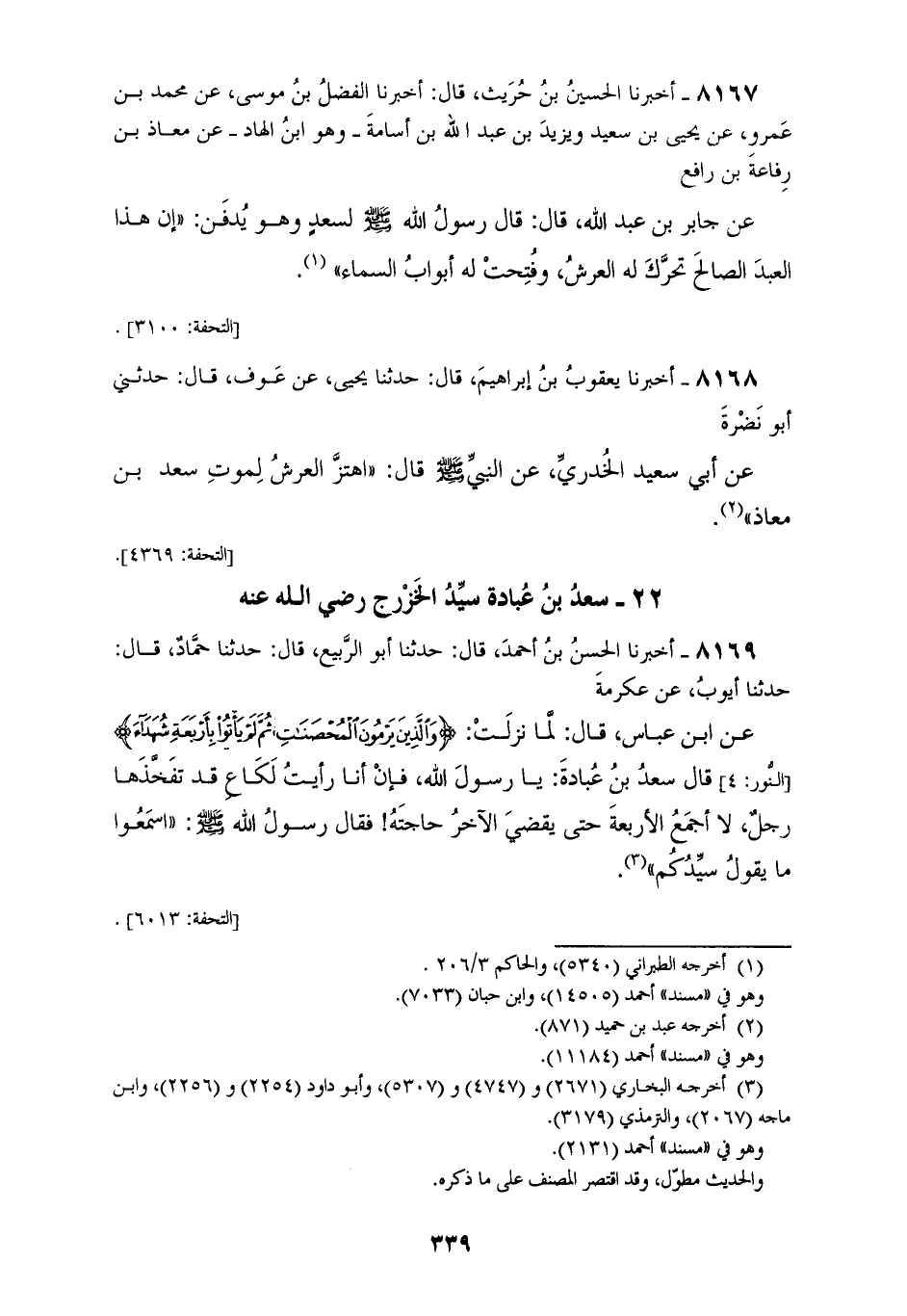 8168 - أَخْبَرَنَا يَعْقُوبُ بْنُ إِبْرَاهِيمَ قَالَ: حَدَّثَنَا يَحْيَى، عَنْ عَوْفٍ قَالَ: حَدَّثَنِي أَبُو نَضْرَةَ، عَنْ أَبِي سَعِيدٍ الْخُدْرِيِّ، عَنِ النَّبِيِّ صَلَّى اللهُ عَلَيْهِ وَسَلَّمَ قَالَ: «§اهْتَزَّ الْعَرْشُ لِمَوْتِ سَعْدِ بْنِ مُعَاذٍ»