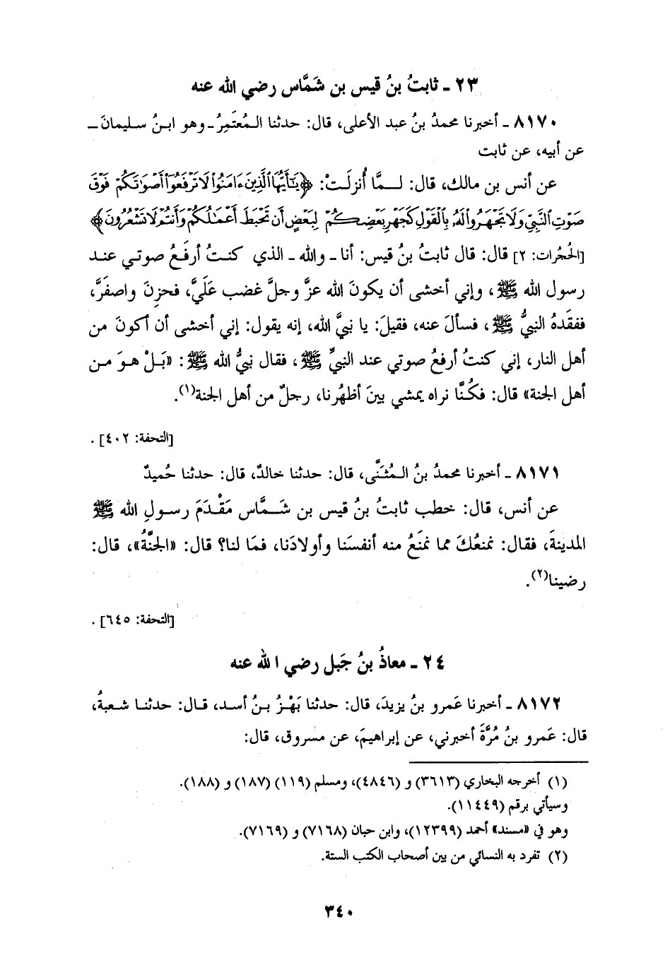 8170 - أَخْبَرَنَا مُحَمَّدُ بْنُ عَبْدِ الْأَعْلَى قَالَ: حَدَّثَنَا الْمُعْتَمِرُ وَهُوَ ابْنُ سُلَيْمَانَ، عَنْ أَبِيهِ عَنْ ثَابِتٍ عَنْ أَنَسِ بْنِ مَالِكٍ قَالَ: §لَمَّا أُنْزِلَتْ {يَا أَيُّهَا الَّذِينَ آمَنُوا لَا تَرْفَعُوا أَصْوَاتَكُمْ فَوْقَ صَوْتِ النَّبِيِّ وَلَا تَجْهَرُوا لَهُ بِالْقَوْلِ كَجَهْرِ بَعْضِكُمْ لِبَعْضٍ أَنْ تَحْبَطَ أَعْمَالُكُمْ وَأَنْتُمْ لَا تَشْعُرُونَ} [الحجرات: 2] قَالَ: قَالَ ثَابِتُ بْنُ قَيْسٍ: «أَنَا وَاللهِ الَّذِي كُنْتُ أَرْفَعُ صَوْتِي عِنْدَ رَسُولِ اللهِ صَلَّى اللهُ عَلَيْهِ وَسَلَّمَ، وَإِنِّي أَخْشَى أَنْ يَكُونَ اللهُ عَزَّ وَجَلَّ غَضِبَ عَلَيَّ فَحَزِنَ، وَاصْفَرَّ، فَفَقَدَهُ النَّبِيُّ صَلَّى اللهُ عَلَيْهِ وَسَلَّمَ، فَسَأَلَ عَنْهُ» فَقِيلَ: يَا نَبِيَّ اللهِ، إِنَّهُ يَقُولُ: " إِنِّي أَخْشَى أَنْ أَكُونَ مِنْ أَهْلِ النَّارِ إِنِّي كُنْتُ أَرْفَعُ صَوْتِي عِنْدَ النَّبِيِّ صَلَّى اللهُ عَلَيْهِ وَسَلَّمَ فَقَالَ نَبِيُّ اللهِ صَلَّى اللهُ عَلَيْهِ وَسَلَّمَ: «بَلْ هُوَ مِنْ أَهْلِ الْجَنَّةِ» قَالَ: «فَكُنَّا نَرَاهُ يَمْشِي بَيْنَ أَظْهُرِنَا، رَجُلٌ مِنْ أَهْلِ الْجَنَّةِ»