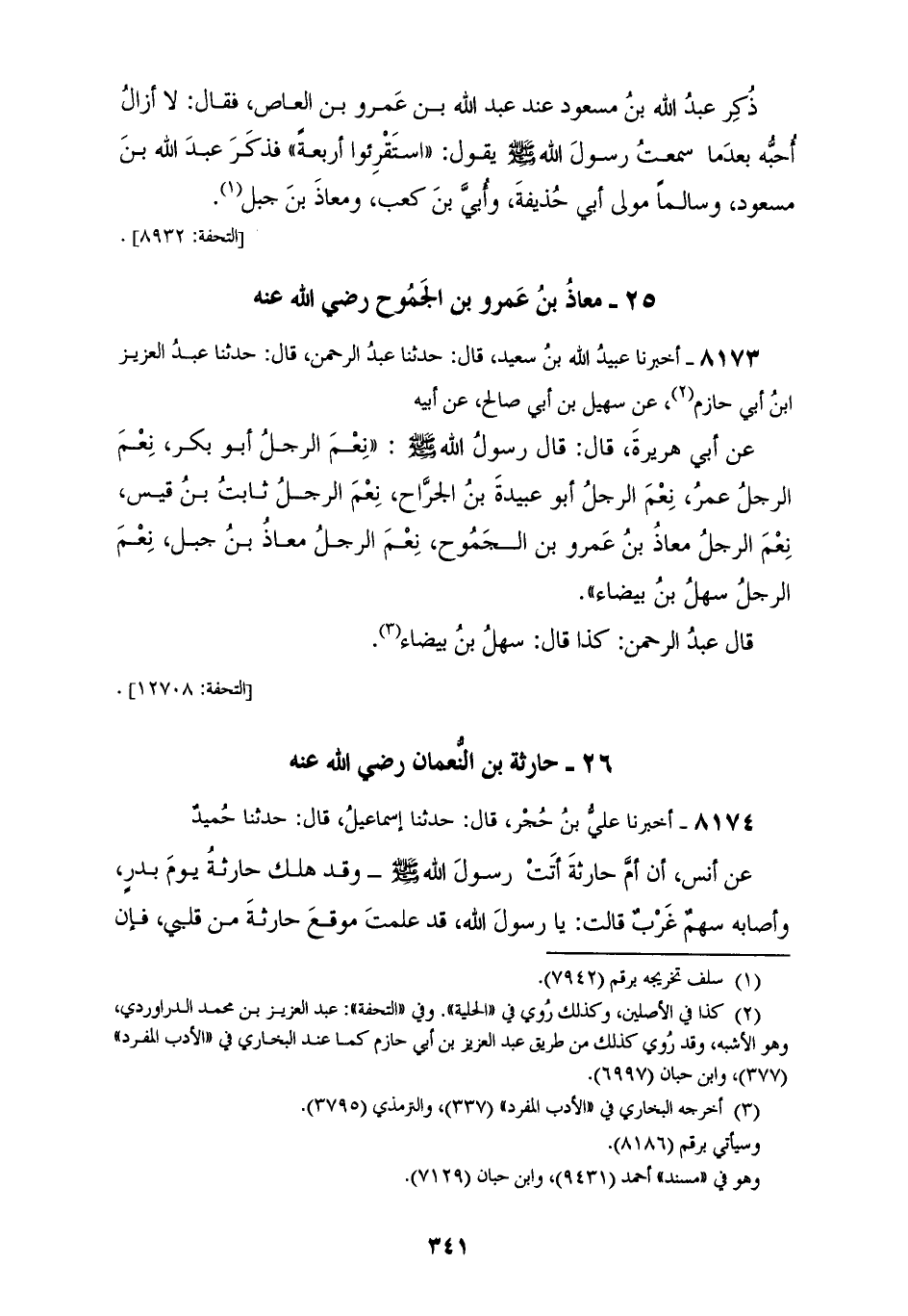 8172 - أَخْبَرَنَا عَمْرُو بْنُ يَزِيدَ قَالَ: حَدَّثَنَا بَهْزُ بْنُ أَسَدٍ قَالَ: حَدَّثَنَا شُعْبَةُ قَالَ عَمْرُو بْنُ مُرَّةَ أَخْبَرَنِي عَنْ إِبْرَاهِيمَ، عَنْ مَسْرُوقٍ قَالَ: ذُكِرَ عَبْدُ اللهِ بْنُ مَسْعُودٍ عِنْدَ عَبْدِ اللهِ بْنِ عَمْرِو بْنِ الْعَاصِ، فَقَالَ: لَا أَزَالُ أُحِبُّهُ بَعْدَمَا سَمِعْتُ رَسُولَ اللهِ صَلَّى اللهُ عَلَيْهِ وَسَلَّمَ يَقُولُ: «§اسْتَقْرِئُوا أَرْبَعَةً» فَذَكَرَ عَبْدَ اللهِ بْنَ مَسْعُودٍ، وَسَالِمًا مَوْلَى أَبِي حُذَيْفَةَ، وَأُبَيَّ بْنَ كَعْبٍ، وَمُعَاذَ بْنَ جَبَلٍ