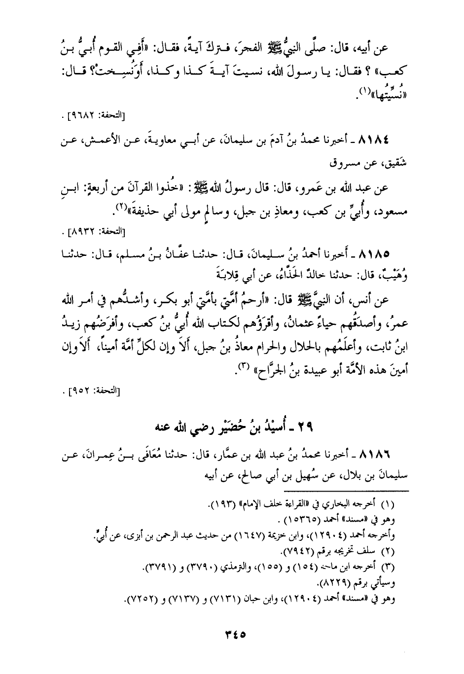 8184 - أَخْبَرَنَا مُحَمَّدُ بْنُ آدَمَ بْنِ سُلَيْمَانَ، عَنْ أَبِي مُعَاوِيَةَ، عَنِ الْأَعْمَشِ، عَنْ شَقِيقٍ، عَنْ مَسْرُوقٍ، عَنْ عَبْدِ اللهِ بْنِ عَمْرٍو قَالَ: قَالَ رَسُولُ اللهِ صَلَّى اللهُ عَلَيْهِ وَسَلَّمَ: " §خُذُوا الْقُرْآنَ مِنْ أَرْبَعَةٍ: ابْنِ مَسْعُودٍ، وَأُبَيِّ بْنِ كَعْبٍ، وَمُعَاذِ بْنِ جَبَلٍ، وَسَالِمٍ مَوْلَى أَبِي حُذَيْفَةَ "