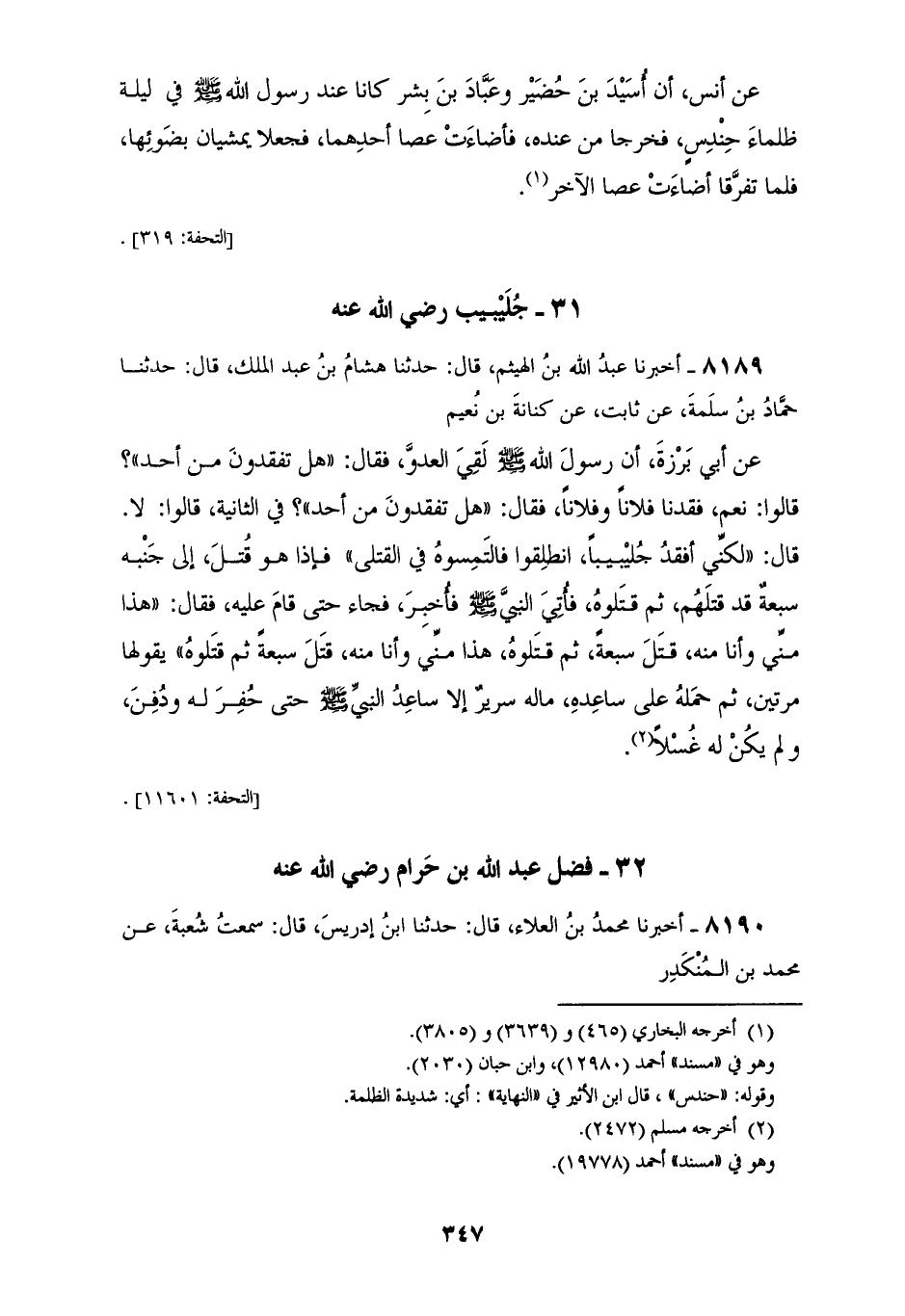 8189 - أَخْبَرَنَا عَبْدُ اللهِ بْنُ الْهَيْثَمِ قَالَ: حَدَّثَنَا هِشَامُ بْنُ عَبْدِ الْمَلِكِ قَالَ: حَدَّثَنَا حَمَّادُ بْنُ سَلَمَةَ، عَنْ ثَابِتٍ، عَنْ كِنَانَةَ بْنِ نُعَيْمٍ، عَنْ أَبِي بَرْزَةَ، أَنَّ رَسُولَ اللهِ صَلَّى اللهُ عَلَيْهِ وَسَلَّمَ لَقِيَ الْعَدُوَّ فَقَالَ: «§هَلْ تَفْقِدُونَ مِنْ أَحَدٍ؟» قَالُوا: نَعَمْ، فَقَدْنَا فُلَانًا وَفُلَانًا فَقَالَ: «هَلْ تَفْقِدُونَ مِنْ أَحَدٍ فِي الثَّانِيَةِ؟» قَالُوا: لَا قَالَ: «لَكِنِّي أَفْقِدُ جُلَيْبِيبًا، انْطَلِقُوا فَالْتَمِسُوهُ فِي الْقَتْلَى» فَإِذَا هُوَ قُتِلَ إِلَى جَنْبِهِ سَبْعَةٌ، قَدْ قَتَلَهُمْ، ثُمَّ قَتَلُوهُ فَأُتِيَ النَّبِيُّ صَلَّى اللهُ عَلَيْهِ وَسَلَّمَ فَأُخْبِرَ فَجَاءَ حَتَّى قَامَ عَلَيْهِ فَقَالَ: «هَذَا مِنِّي، وَأَنَا مِنْهُ، قَتَلَ سَبْعَةً، ثُمَّ قَتَلُوهُ، هَذَا مِنِّي، وَأَنَا مِنْهُ، قَتَلَ سَبْعَةً، ثُمَّ قَتَلُوهُ» يَقُولُهَا مَرَّتَيْنِ، ثُمَّ حَمَلَهُ عَلَى سَاعِدِهِ، مَا لَهُ سَرِيرٌ إِلَّا سَاعِدَ النَّبِيِّ صَلَّى اللهُ عَلَيْهِ وَسَلَّمَ حَتَّى حُفِرَ لَهُ، وَدُفِنَ وَلَمْ يَكُنْ لَهُ غُسْلًا