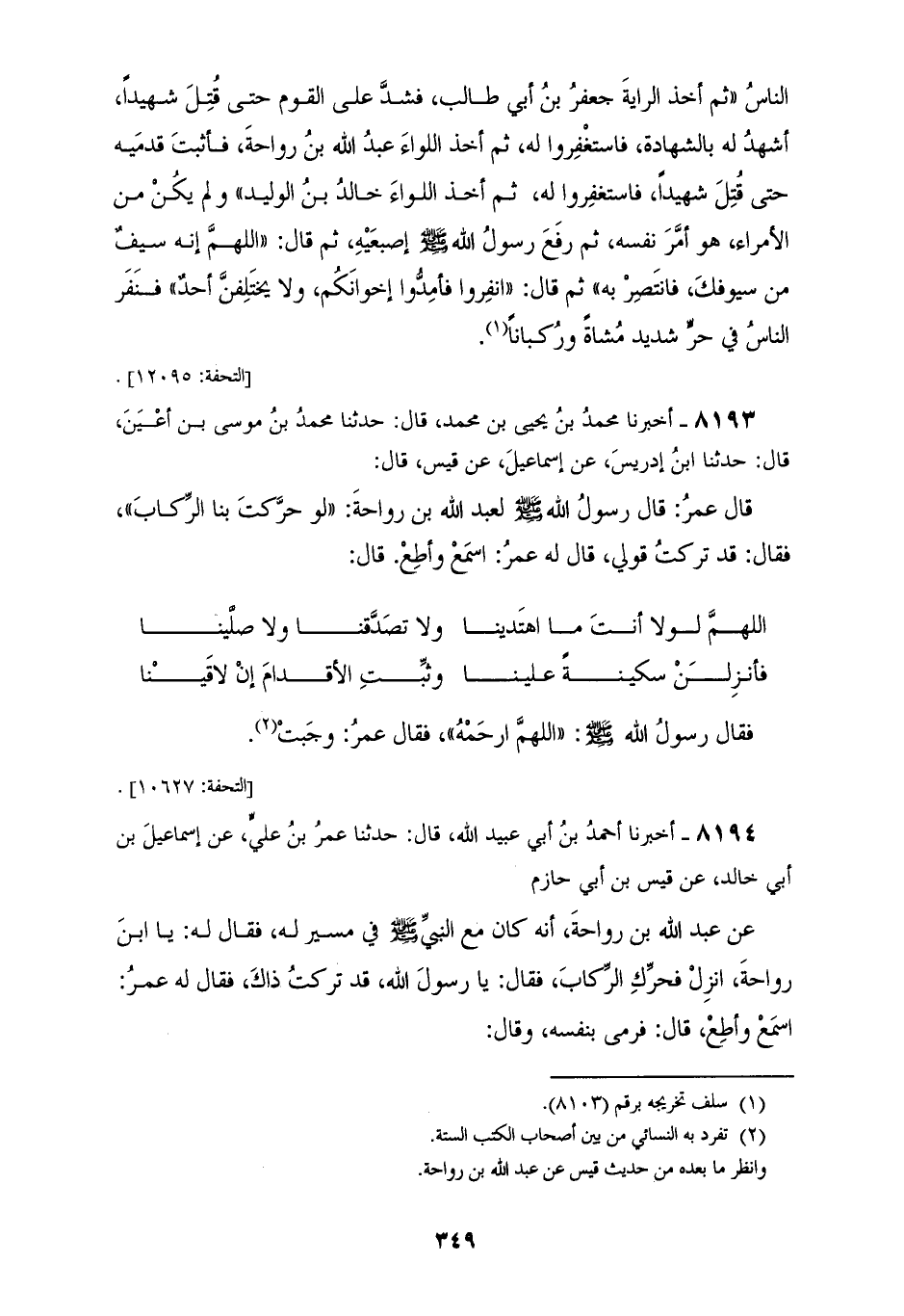 8193 - أَخْبَرَنَا مُحَمَّدُ بْنُ يَحْيَى بْنُ مُحَمَّدٍ قَالَ: حَدَّثَنَا مُحَمَّدُ بْنُ مُوسَى بْنُ أَعْيَنَ قَالَ: حَدَّثَنَا ابْنُ إِدْرِيسَ، عَنْ إِسْمَاعِيلَ، عَنْ قَيْسٍ قَالَ: قَالَ عُمَرُ: قَالَ رَسُولُ اللهِ صَلَّى اللهُ عَلَيْهِ وَسَلَّمَ لِعَبْدِ اللهِ بْنِ رَوَاحَةَ: «§لَوْ حَرَّكْتَ بِنَا الرِّكَابَ». فَقَالَ: قَدْ تَرَكْتُ قَوْلِي، قَالَ لَهُ عُمَرُ: اسْمَعْ وَأَطِعْ، قَالَ:
