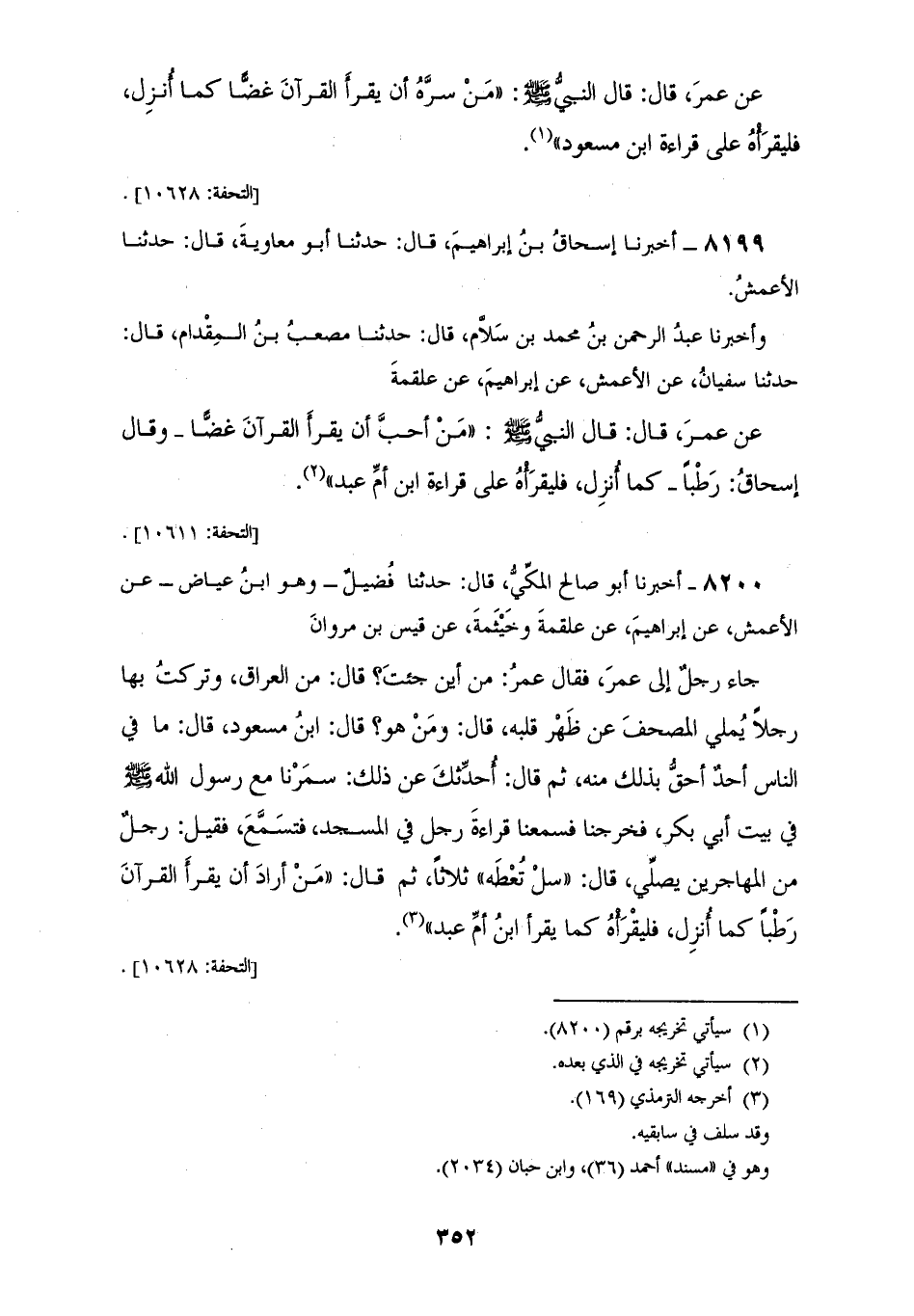 8200 - أَخْبَرَنَا أَبُو صَالِحٍ الْمَكِّيُّ قَالَ: حَدَّثَنَا فُضَيْلٌ وَهُوَ ابْنُ عِيَاضٍ، عَنِ الْأَعْمَشِ، عَنْ إِبْرَاهِيمَ، عَنْ عَلْقَمَةَ، وَخَيْثَمَةَ، عَنْ قَيْسِ بْنِ مَرْوَانَ، جَاءَ رَجُلٌ إِلَى عُمَرَ: فَقَالَ عُمَرُ: «§مِنْ أَيْنَ جِئْتَ؟» قَالَ: مِنَ الْعِرَاقِ، وَتَرَكْتُ بِهَا رَجُلًا يُمَلِّي الْمُصْحَفَ عَنْ ظَهْرِ قَلْبِهِ قَالَ: «وَمَنْ هُوَ؟» قَالَ ابْنُ مَسْعُودٍ قَالَ: «مَا فِي النَّاسِ أَحَدٌ أَحَقُّ بِذَلِكَ مِنْهُ» ثُمَّ قَالَ: «أُحَدِّثُكَ عَنْ ذَلِكَ سَمَرْنَا مَعَ رَسُولِ اللهِ صَلَّى اللهُ عَلَيْهِ وَسَلَّمَ فِي بَيْتِ أَبِي بَكْرٍ فَخَرَجْنَا فَسَمِعْنَا قِرَاءَةَ رَجُلٍ فِي الْمَسْجِدِ، فَتَسَمَّعَ» فَقِيلَ: رَجُلٌ مِنَ الْمُهَاجِرِينَ يُصَلِّي قَالَ: «سَلْ تُعْطَهْ ثَلَاثًا» ثُمَّ قَالَ: «مَنْ أَرَادَ أَنْ يَقْرَأَ الْقُرْآنَ رَطْبًا كَمَا أُنْزِلَ فَلْيَقْرَأْهُ كَمَا يَقْرَأُ ابْنُ أُمِّ عَبْدٍ»