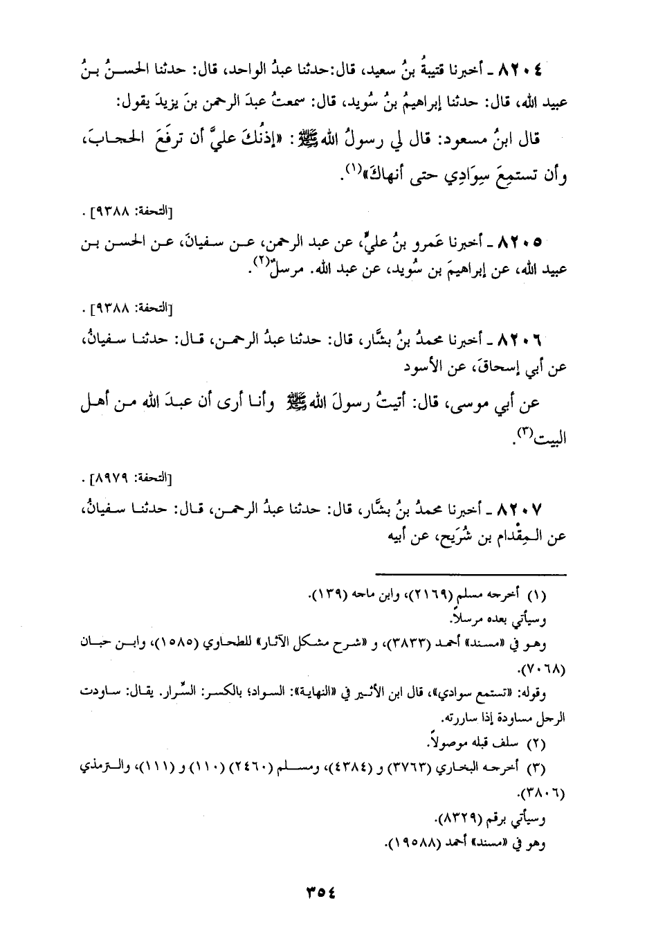 8204 - أَخْبَرَنَا قُتَيْبَةُ بْنُ سَعِيدٍ قَالَ: حَدَّثَنَا عَبْدُ الْوَاحِدِ قَالَ: حَدَّثَنَا الْحسَنُ بْنُ عُبَيْدِ اللهِ قَالَ: حَدَّثَنَا إِبْرَاهِيمُ بْنُ سُوَيْدٍ قَالَ: سَمِعْتُ عَبْدَ الرَّحْمَنِ بْنَ يَزِيدَ يَقُولُ: قَالَ ابْنُ مَسْعُودٍ: قَالَ لِي رَسُولُ اللهِ صَلَّى اللهُ عَلَيْهِ وَسَلَّمَ: «§إِذْنُكَ عَلَيَّ أَنْ تَرْفَعُ الْحِجَابَ، وَأَنْ تَسْتَمِعَ سَوَادِي حَتَّى أَنْهَاكَ»