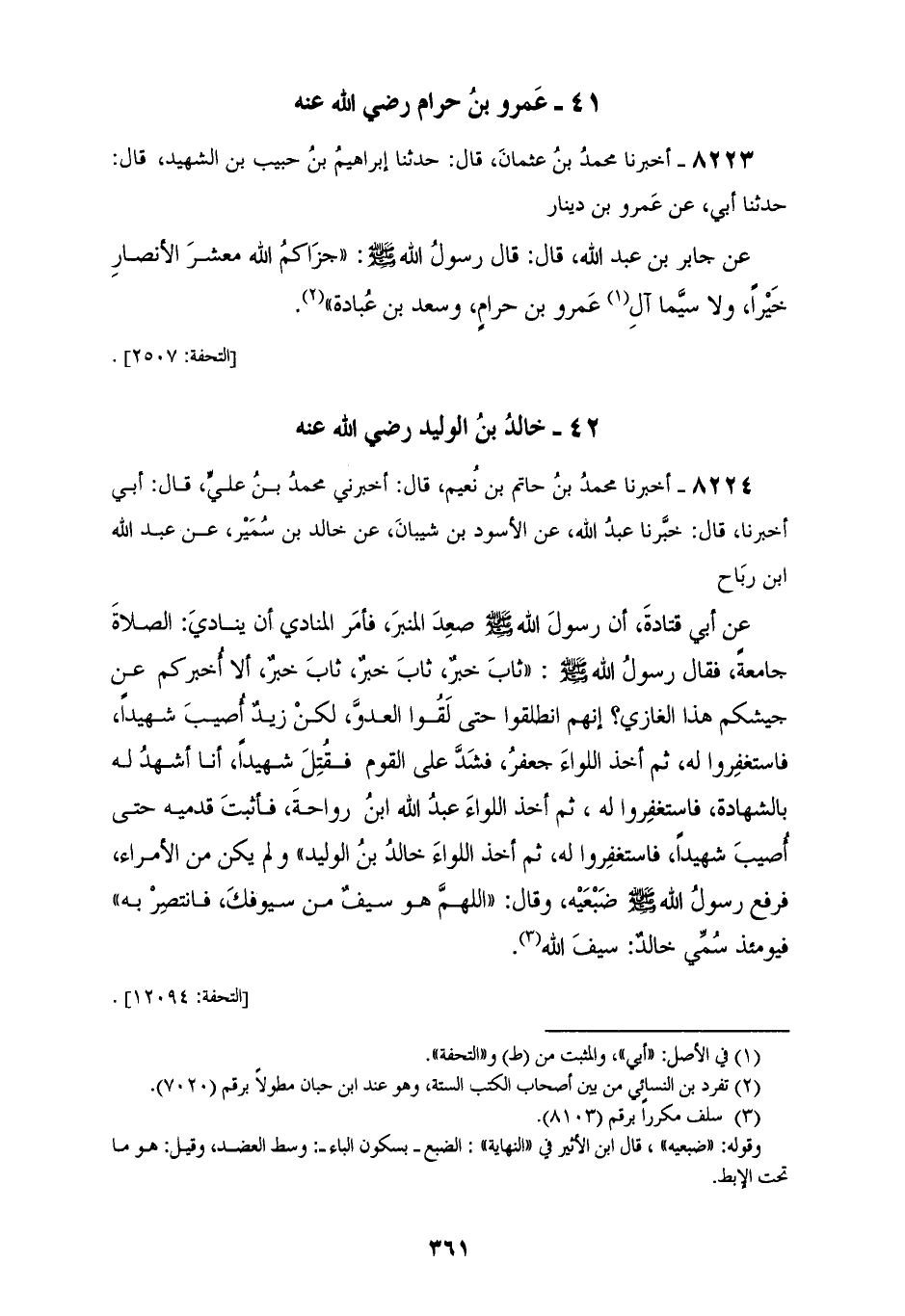 8224 - أَخْبَرَنَا مُحَمَّدُ بْنُ حَاتِمِ بْنِ نُعَيْمٍ قَالَ: أَخْبَرَنِي مُحَمَّدُ بْنُ عَلِيٍّ قَالَ أَبِي أَخْبَرَنَا قَالَ: خَبَّرَنَا عَبْدُ اللهِ، عَنِ الْأَسْوَدِ بْنِ شَيْبَانَ، عَنْ خَالِدِ بْنِ سُمَيْرٍ، عَنْ عَبْدِ اللهِ بْنِ رَبَاحٍ، عَنْ أَبِي قَتَادَةَ، أَنَّ رَسُولَ اللهِ صَلَّى اللهُ عَلَيْهِ وَسَلَّمَ «§صَعِدَ الْمِنْبَرَ فَأَمَرَ الْمُنَادِيَ أَنْ يُنَادِيَ الصَّلَاةُ جَامِعَةٌ» فَقَالَ رَسُولُ اللهِ صَلَّى اللهُ عَلَيْهِ وَسَلَّمَ: «ثَابَ خَبَرٌ، ثَابَ خَبَرٌ، ثَابَ خَبَرٌ، أَلَا أُخْبِرُكُمْ عَنْ جَيْشِكُمْ هَذَا الْغَازِي؟ إِنَّهُمُ انْطَلِقُوا حَتَّى لَقُوَا الْعَدُوَّ لَكِنْ زَيْدَ أُصِيبَ شَهِيدًا، فَاسْتَغْفِرُوا لَهُ، ثُمَّ أَخَذَ اللِّوَاءَ جَعْفَرٌ فَشَدَّ عَلَى الْقَوْمِ، فَقُتِلَ شَهِيدًا، أَنَا أَشْهَدُ لَهُ بِالشَّهَادَةِ، فَاسْتَغْفِرُوا لَهُ، ثُمَّ أَخَذَ اللِّوَاءَ عَبْدُ اللهِ بْنُ رَوَاحَةَ، فَأَثْبَتَ قَدَمَيْهِ حَتَّى أُصِيبَ شَهِيدًا، فَاسْتَغْفِرُوا لَهُ، ثُمَّ أَخَذَ اللِّوَاءَ خَالِدُ بْنُ الْوَلِيدِ، وَلَمْ يَكُنْ مِنَ الْأُمَرَاءِ فَرَفَعَ رَسُولُ اللهِ صَلَّى اللهُ عَلَيْهِ وَسَلَّمَ ضَبْعَيْهِ» وَقَالَ: «اللهُمَّ هُوَ سَيْفٌ مِنْ سُيُوفِكَ، فَانْتَصِرْ بِهِ» فَيَوْمَئِذٍ سُمَيَّ خَالِدٌ سَيْفَ اللهِ