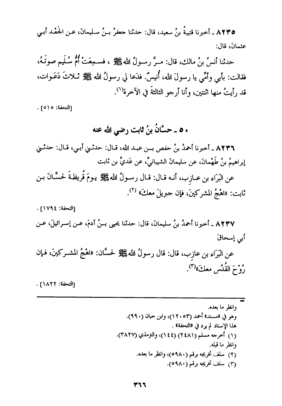8236 - أَخْبَرَنَا أَحْمَدُ بْنُ حَفْصِ بْنِ عَبْدِ اللهِ قَالَ: حَدَّثَنِي أَبِي قَالَ: حَدَّثَنِي إِبْرَاهِيمُ بْنُ طَهْمَانَ، عَنْ سُلَيْمَانَ الشَّيْبَانِيِّ، عَنْ عَدِيِّ بْنِ ثَابِتٍ، عَنِ الْبَرَاءِ بْنِ عَازِبٍ، أَنَّهُ قَالَ: قَالَ رَسُولُ اللهِ صَلَّى اللهُ عَلَيْهِ وَسَلَّمَ: §يَوْمَ قُرَيْظَةَ لِحَسَّانَ بْنِ ثَابِتٍ: «اهْجُ الْمُشْرِكِينَ، فَإِنَّ جِبْرِيلَ مَعَكَ»