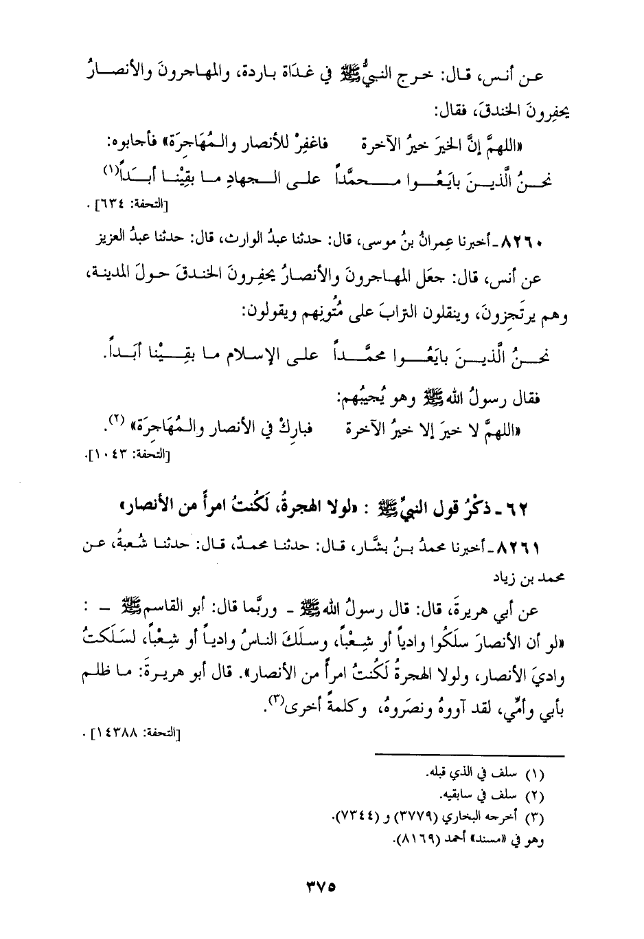 8260 - أَخْبَرَنَا عِمْرَانُ بْنُ مُوسَى قَالَ: حَدَّثَنَا عَبْدُ الْوَارِثِ قَالَ: حَدَّثَنَا عَبْدُ الْعَزِيزِ، عَنْ أَنَسٍ قَالَ: §جَعَلَ الْمُهَاجِرُونَ وَالْأَنْصَارُ يَحْفِرُونَ الْخَنْدَقَ حَوْلَ الْمَدِينَةِ وَهُمْ يَرْتَجِزُونَ وَيَنْقُلُونَ التُّرَابَ عَلَى مُتُونِهِمْ وَيَقُولُونَ: «نَحْنُ الَّذِينَ بَايَعُوا مُحَمَّدًا عَلَى الْإِسْلَامِ مَا بَقِينَا أَبَدًا» فَقَالَ رَسُولُ اللهِ صَلَّى اللهُ عَلَيْهِ وَسَلَّمَ: «وَهُوَ يُجِيبُهُمُ اللهُمَّ لَا خَيْرَ إِلَّا خَيْرُ الْآخِرَةِ، فَبَارِكْ فِي الْأَنْصَارِ وَالْمُهَاجِرَةِ»
