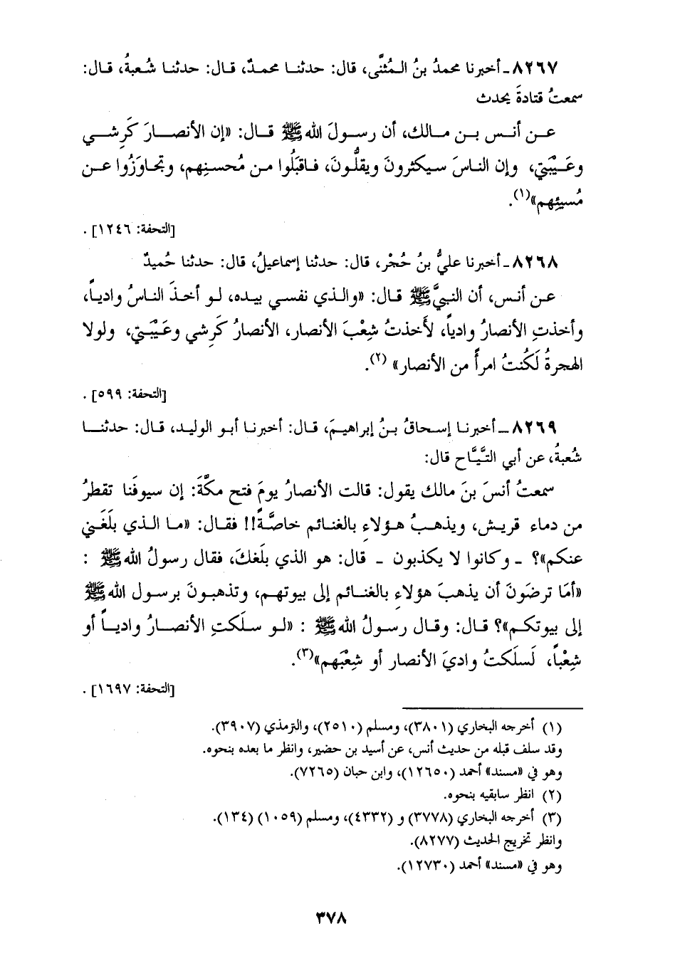 8269 - أَخْبَرَنَا إِسْحَاقُ بْنُ إِبْرَاهِيمَ قَالَ: أَخْبَرَنَا أَبُو الْوَلِيدِ قَالَ: حَدَّثَنَا شُعْبَةُ، عَنْ أَبِي التَّيَّاحِ قَالَ: سَمِعْتُ أَنَسَ بْنَ مَالِكٍ يَقُولُ: قَالَتِ الْأَنْصَارُ يَوْمَ فَتْحِ مَكَّةَ: «إِنَّ سُيُوفَنَا تَقْطُرُ مِنْ دِمَاءِ قُرَيْشٍ، وَيَذْهَبُ هَؤُلَاءِ بِالْغَنَائِمِ خَاصَّةً» فَقَالَ: «مَا الَّذِي بَلَغَنِي عَنْكُمْ؟» وَكَانُوا لَا يَكْذِبُونَ قَالَ: «هُوَ الَّذِي بَلَغَكَ» فَقَالَ رَسُولُ اللهِ صَلَّى اللهُ عَلَيْهِ وَسَلَّمَ: «§أَمَا تَرْضَوْنَ أَنْ يَذْهَبَ هَؤُلَاءِ بِالْغَنَائِمِ إِلَى بُيُوتِهِمْ وَتَذْهَبُونَ بِرَسُولِ اللهِ صَلَّى اللهُ عَلَيْهِ وَسَلَّمَ إِلَى بُيُوتِكُمْ؟» قَالَ: وَقَالَ رَسُولُ اللهِ صَلَّى اللهُ عَلَيْهِ وَسَلَّمَ: «لَوْ سَلَكَتِ الْأَنْصَارُ وَادِيًا، أَوْ شِعْبًا لَسَلَكْتُ وَادِيَ الْأَنْصَارِ، أَوْ شِعْبَهُمْ»