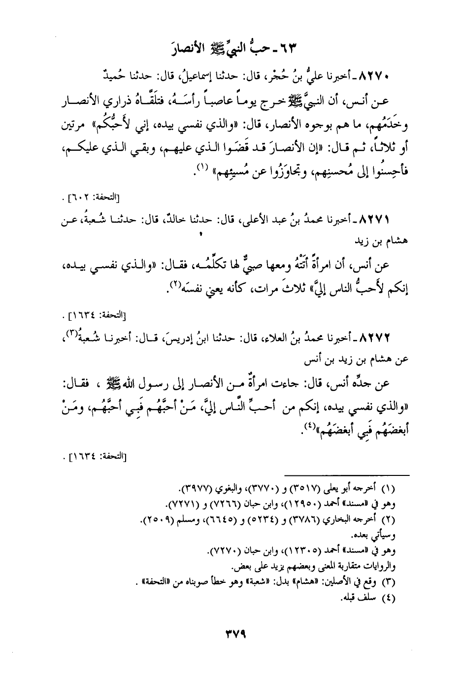 8270 - أَخْبَرَنَا عَلِيُّ بْنُ حُجْرٍ قَالَ: حَدَّثَنَا إِسْمَاعِيلُ قَالَ: حَدَّثَنَا حُمَيْدٌ، عَنْ أَنَسٍ، أَنَّ النَّبِيَّ صَلَّى اللهُ عَلَيْهِ وَسَلَّمَ §خَرَجَ يَوْمًا عَاصِبًا رَأْسَهُ فَتَلَقَّاهُ ذَرَارِيُّ الْأَنْصَارِ وَخَدَمُهُمْ مَا هُمْ بِوُجُوهِ الْأَنْصَارِ قَالَ: «وَالَّذِي نَفْسِي بِيَدِهِ إِنِّي لَأُحِبُّكُمْ مَرَّتَيْنِ، أَوْ ثَلَاثًا» ثُمَّ قَالَ: «إِنَّ الْأَنْصَارَ قَدْ قَضَوَا الَّذِي عَلَيْهِمْ وَبَقِيَ الَّذِي عَلَيْكُمْ فَأَحْسِنُوا إِلَى مُحْسِنِهِمْ وَتَجَاوَزُوا عَنْ مُسِيئِهِمْ»