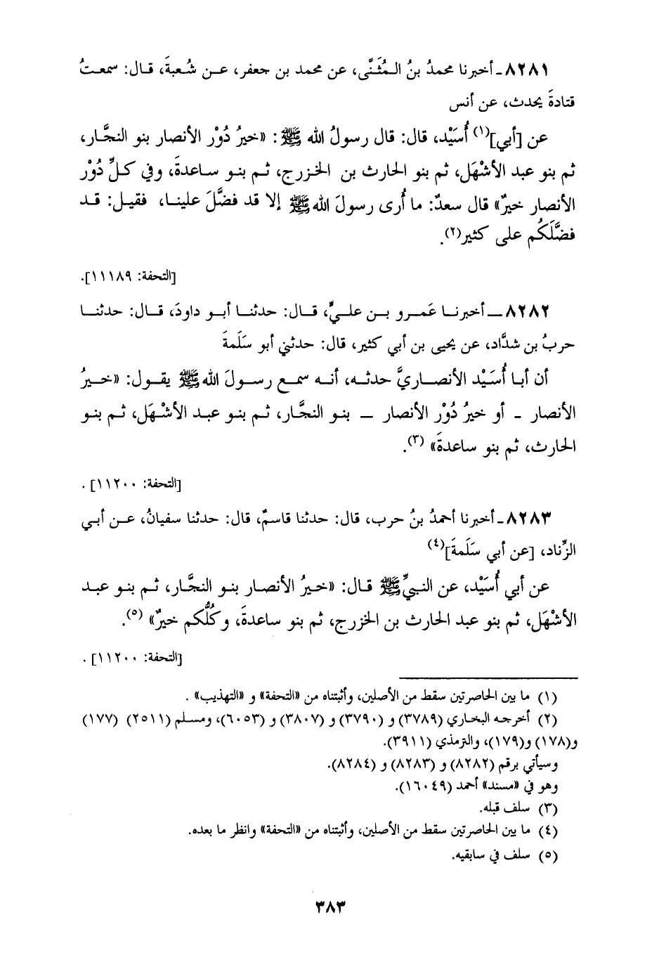 8281 - أَخْبَرَنَا مُحَمَّدُ بْنُ الْمُثَنَّى، عَنْ مُحَمَّدِ بْنِ جَعْفَرٍ، عَنْ شُعْبَةَ قَالَ: سَمِعْتُ قَتَادَةَ، يُحَدِّثُ عَنْ أَنَسٍ، عَنْ أَبِي أُسَيْدٍ قَالَ: قَالَ رَسُولُ اللهِ صَلَّى اللهُ عَلَيْهِ وَسَلَّمَ: «§خَيْرُ دُورِ الْأَنْصَارِ بَنُو النَّجَّارِ، ثُمَّ بَنُو عَبْدِ الْأَشْهَلِ، ثُمَّ بَنُو الْحَارِثِ بْنِ الْخَزْرَجِ، ثُمَّ بَنُو سَاعِدَةَ، وَفِي كُلِّ دُورِ الْأَنْصَارِ خَيْرُ» قَالَ سَعْدٌ: مَا أَرَى رَسُولَ اللهِ صَلَّى اللهُ عَلَيْهِ وَسَلَّمَ، إِلَّا قَدْ فَضَّلَ عَلَيْنَا فَقِيلَ: «قَدْ فَضَّلَكُمْ عَلَى كَثِيرٍ»