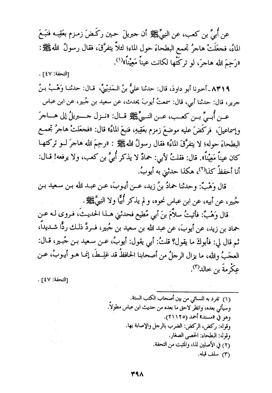 8319 - أَخْبَرَنَا أَبُو دَاوُدَ قَالَ: حَدَّثَنَا عَلِيُّ بْنُ الْمَدِينِيِّ قَالَ: حَدَّثَنَا وَهْبُ بْنُ جَرِيرٍ قَالَ: حَدَّثَنَا أَبِي قَالَ: سَمِعْتُ أَيُّوبَ، يُحَدِّثُ، عَنْ سَعِيدِ بْنِ جُبَيْرٍ، عَنِ ابْنِ عَبَّاسٍ، عَنْ أُبَيِّ بْنِ كَعْبٍ، عَنِ النَّبِيِّ صَلَّى اللهُ عَلَيْهِ وَسَلَّمَ قَالَ: «نَزَلَ جِبْرِيلُ إِلَى هَاجَرَ وَإِسْمَاعِيلَ، فَرَكَضَ عَلَيْهِ مَوْضِعَ زَمْزَمَ بِعَقِبِهِ فَنَبَعَ الْمَاءُ» قَالَ: فَجَعَلَتْ هَاجَرُ تَجْمَعَ الْبَطْحَاءَ حَوْلَهُ لَا يَتَفَرَّقُ الْمَاءُ، فَقَالَ رَسُولُ اللهِ صَلَّى اللهُ عَلَيْهِ وَسَلَّمَ: «§رَحِمَ اللهُ هَاجَرَ، لَوْ تَرَكَتْهَا كَانَ عَيْنَا مَعِينًا». قَالَ: فَقُلْتُ لِأَبِي حَمَّادٌ: لَا يَذْكُرُ أُبَيَّ بْنَ كَعْبٍ، وَلَا يَرْفَعُهُ قَالَ: «أَنَا أَحْفَظُ لِذَا هَكَذَا» حَدَّثَنِي بِهِ أَيُّوبُ، قَالَ وَهْبٌ، وَحَدَّثَنَا حَمَّادُ بْنُ زَيْدٍ، عَنْ أَيُّوبَ، عَنْ عَبْدِ اللهِ بْنِ سَعِيدِ بْنِ جُبَيْرٍ، عَنْ أَبِيهِ، عَنِ ابْنِ عَبَّاسٍ نَحْوَهُ وَلَمْ يَذْكُرْ أُبَيًّا وَلَا النَّبِيَّ صَلَّى اللهُ عَلَيْهِ وَسَلَّمَ قَالَ وَهْبٌ: " فَأَتَيْتُ سَلَامَ بْنَ أَبِي مُطِيعٍ فَحَدَّثَنِي هَذَا الْحَدِيثَ، فَرَوَى لَهُ عَنْ حَمَّادِ بْنِ زَيْدٍ، عَنْ أَيُّوبَ، عَنْ عَبْدِ اللهِ بْنِ سَعِيدِ بْنِ جُبَيْرٍ، فَرَدَّ ذَلِكَ رَدًّا شَدِيدًا ثُمَّ قَالَ لِي: «فَأَبُوكَ مَا يَقُولُ؟» قُلْتُ: أَبِي يَقُولُ: أَيُّوبُ عَنْ سَعِيدِ بْنِ جُبَيْرٍ قَالَ: «الْعَجَبُ وَاللهِ، مَا يَزَالُ الرَّجُلُ مِنْ أَصْحَابِنَا الْحَافِظُ قَدْ غَلِطَ» إِنَّمَا هُوَ أَيُّوبُ عَنْ عِكْرِمَةَ بْنِ خَالِدٍ