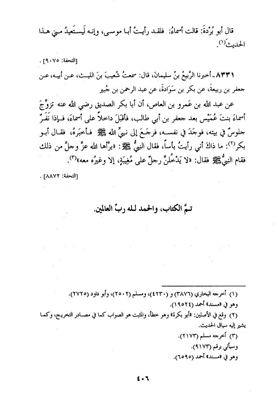 8331 - أَخْبَرَنَا الرَّبِيعُ بْنُ سُلَيْمَانَ قَالَ: سَمِعْتُ شُعَيْبَ بْنَ اللَّيْثِ، عَنْ أَبِيهِ، عَنْ جَعْفَرِ بْنِ رَبِيعَةَ، عَنْ بَكْرِ بْنِ سَوَادَةَ، عَنْ عَبْدِ الرَّحْمَنِ بْنِ جُبَيْرٍ، عَنْ عَبْدِ اللهِ بْنِ عَمْرِو بْنِ الْعَاصِ، أَنَّ أَبَا بَكْرٍ الصِّدِّيقٍ رَضِيَ اللهُ عَنْهُ §تَزَوَّجَ أَسْمَاءَ بِنْتَ عُمَيْسٍ، بَعْدَ جَعْفَرِ بْنِ أَبِي طَالِبٍ، فَأَقْبَلَ دَاخِلًا عَلَى أَسْمَاءَ، فَإِذَا نَفَرٌ جُلُوسٌ فِي بَيْتِهِ، فَوَجَدَ فِي نَفْسِهِ، فَرَجَعَ إِلَى نَبِيِّ اللهِ صَلَّى اللهُ عَلَيْهِ وَسَلَّمَ فَأَخْبَرَهُ فَقَالَ أَبُو بَكْرٍ: «مَا ذَاكَ أَنِّي رَأَيْتُ بَأْسًا؟» فَقَالَ النَّبِيُّ صَلَّى اللهُ عَلَيْهِ وَسَلَّمَ بَرَّأَهَا اللهُ عَزَّ وَجَلَّ مِنْ ذَلِكَ فَقَامَ النَّبِيُّ صَلَّى اللهُ عَلَيْهِ وَسَلَّمَ فَقَالَ: «لَا يَدْخُلَنَّ رَجُلٌ عَلَى مُغِيبَةٍ، إِلَّا وَغَيْرُهُ مَعَهُ»