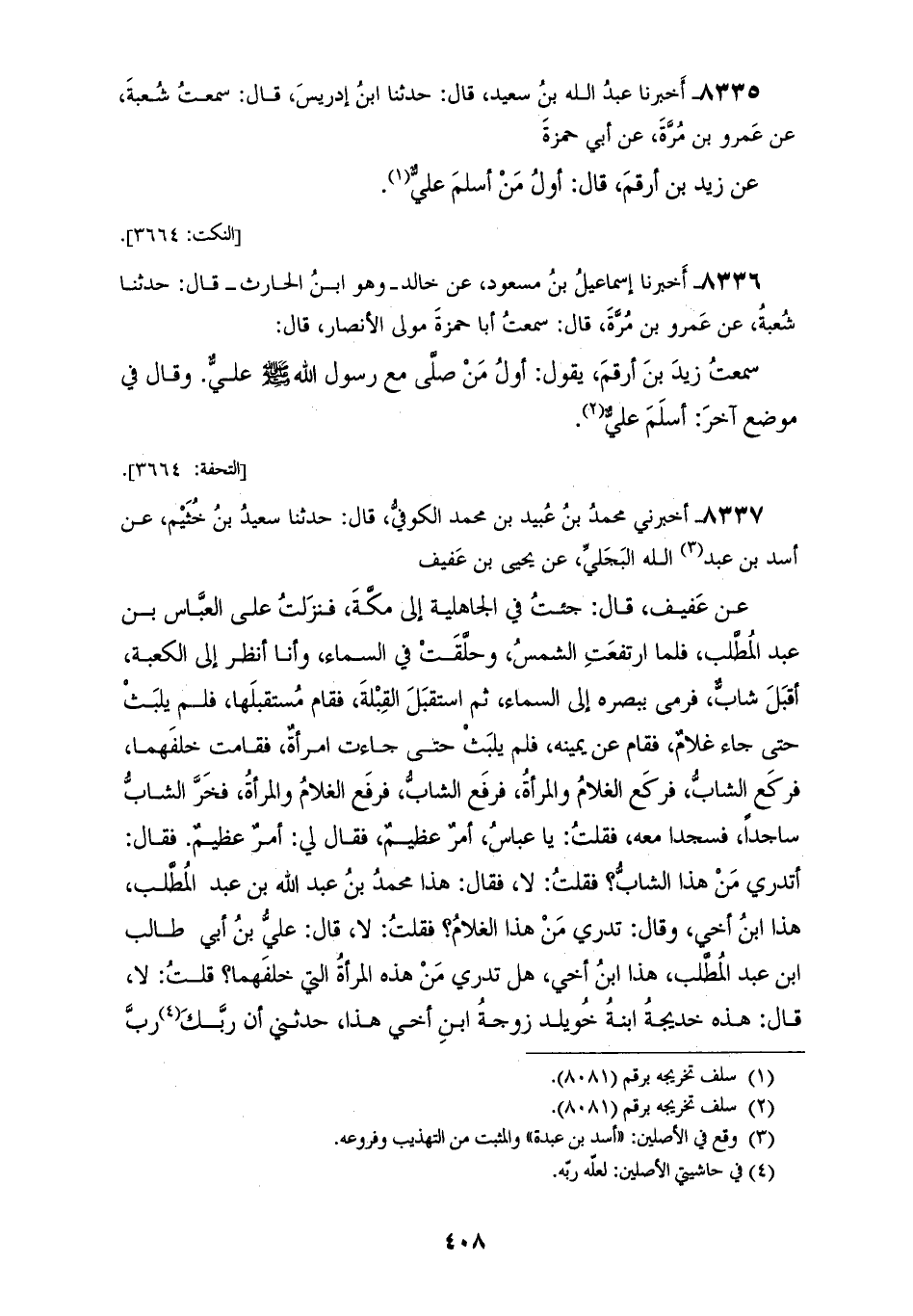 8337 - أَخْبَرَنِي مُحَمَّدُ بْنُ عُبَيْدِ بْنِ مُحَمَّدٍ الْكُوفِيُّ قَالَ: حَدَّثَنَا سَعِيدُ بْنُ خُثَيْمٍ، عَنْ أَسَدِ بْنِ عَبْدِ اللهِ الْبَجَلِيِّ، عَنْ يَحْيَى بْنِ عَفِيفٍ، عَنْ عَفِيفٍ قَالَ: §جِئْتُ فِي الْجَاهِلِيَّةِ إِلَى مَكَّةَ، فَنَزَلْتُ عَلَى الْعَبَّاسِ بْنِ عَبْدِ الْمُطَّلِبِ، فَلَمَّا ارْتَفَعَتِ الشَّمْسُ، وَحَلَّقَتْ فِي السَّمَاءِ، وَأَنَا أَنْظُرُ إِلَى الْكَعْبَةِ أَقْبَلَ شَابٌّ، فَرَمَى بِبَصَرِهِ إِلَى السَّمَاءِ، ثُمَّ اسْتَقْبَلَ الْقِبْلَةَ، فَقَامَ مُسْتَقْبِلَهَا، فَلَمْ يَلْبَثْ حَتَّى جَاءَ غُلَامٌ، فَقَامَ عَنْ يَمِينِهِ، فَلَمْ يَلْبَثْ حَتَّى جَاءَتِ امْرَأَةٌ، فَقَامَتْ خَلْفَهُمَا، فَرَكَعَ الشَّابُّ، فَرَكَعَ الْغُلَامُ وَالْمَرْأَةُ، فَرَفَعَ الشَّابُّ، فَرَفَعَ الْغُلَامُ وَالْمَرْأَةُ، فَخَرَّ الشَّابُّ سَاجِدًا، فَسَجَدَا مَعَهُ فَقُلْتُ: يَا عَبَّاسُ «أَمْرٌ عَظِيمٌ» فَقَالَ لِي: أَمْرٌ عَظِيمٌ؟ فَقَالَ: «أَتَدْرِي مَنْ هَذَا الشَّابُّ؟» فَقُلْتُ: لَا فَقَالَ: " هَذَا مُحَمَّدُ بْنُ عَبْدِ اللهِ بْنِ عَبْدِ الْمُطَّلِبِ، هَذَا ابْنُ أَخِي، وَقَالَ: «تَدْرِي مَنْ هَذَا الْغُلَامُ؟» فَقُلْتُ: لَا قَالَ عَلِيُّ بْنُ أَبِي طَالِبِ بْنِ عَبْدِ الْمُطَّلِبِ، هَذَا ابْنُ أَخِي «هَلْ تَدْرِي مَنْ هَذِهِ الْمَرْأَةُ الَّتِي خَلْفَهُمَا؟» قُلْتُ: لَا قَالَ: «هَذِهِ خَدِيجَةُ ابْنَةُ خُوَيْلِدٍ زَوْجَةُ ابْنِ أَخِي» هَذَا حَدَّثَنِي «أَنَّ رَبَّكَ رَبُّ السَّموَاتِ وَالْأَرْضِ أَمَرَهُ بِهَذَا الدِّينِ الَّذِي هُوَ عَلَيْهِ، وَلَا وَاللهِ مَا عَلَى ظَهْرِ الْأَرْضِ كُلِّهَا أَحَدٌ عَلَى هَذَا الدِّينِ غَيْرُ هَؤُلَاءِ الثَّلَاثَةِ»