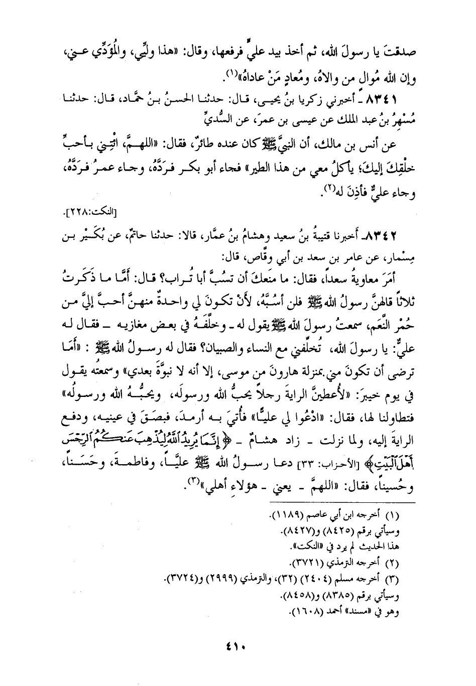 8342 - أَخْبَرَنَا قُتَيْبَةُ بْنُ سَعِيدٍ، وَهِشَامُ بْنُ عَمَّارٍ قَالَا: حَدَّثَنَا حَاتِمٌ، عَنْ بُكَيْرِ بْنِ مِسْمَارٍ، عَنْ عَامِرِ بْنِ سَعْدِ بْنِ أَبِي وَقَّاصٍ قَالَ: أَمَرَ مُعَاوِيَةُ سَعْدًا، فَقَالَ: " مَا مَنَعَكَ أَنْ تَسُبَّ أَبَا تُرَابٍ؟. قَالَ: أَمَا مَا ذَكَرْتُ ثَلَاثًا قَالَهُنَّ رَسُولُ اللهِ صَلَّى اللهُ عَلَيْهِ وَسَلَّمَ فَلَنْ أَسُبَّهُ، لَأَنْ تَكُونَ لِي وَاحِدَةٌ مِنْهُنَّ أَحَبَّ إِلَيَّ مِنْ حُمْرِ النَّعَمِ. سَمِعْتُ رَسُولَ اللهِ صَلَّى اللهُ عَلَيْهِ وَسَلَّمَ يَقُولُ لَهُ، وَخَلَّفَهُ فِي بَعْضِ مَغَازِيهِ، فَقَالَ لَهُ عَلِيٌّ: يَا رَسُولَ اللهِ «تُخَلِّفُنِي مَعَ النِّسَاءِ وَالصِّبْيَانِ؟» فَقَالَ لَهُ رَسُولُ اللهِ صَلَّى اللهُ عَلَيْهِ وَسَلَّمَ: «§أَمَا تَرْضَى أَنْ تَكُونَ مِنِّي بِمَنْزِلَةِ هَارُونَ مِنْ مُوسَى، إِلَّا أَنَّهُ لَا نُبُوَّةَ بَعْدِي؟» وَسَمِعْتُهُ يَقُولُ: فِي يَوْمَ خَيْبَرَ: «لَأُعْطِيَنَّ الرَّايَةَ رَجُلًا يُحِبُّ اللهَ وَرَسُولَهُ، وَيُحِبُّهُ اللهُ وَرَسُولُهُ» فَتَطَاوَلْنَا لَهَا، فَقَالَ: «ادْعُوا لِي عَلِيًّا» فَأُتِيَ بِهِ أَرْمَدَ، فَبَصَقَ فِي عَيْنَيْهِ، وَدَفَعَ الرَّايَةَ إِلَيْهِ، وَلَمَّا نَزَلَتْ، زَادَ هِشَامٌ: {إِنَّمَا يُرِيدُ اللهُ لِيُذْهِبَ عَنْكُمُ الرِّجْسَ أَهْلَ الْبَيْتِ} [الأحزاب: 33] دَعَا رَسُولُ اللهِ صَلَّى اللهُ عَلَيْهِ وَسَلَّمَ عَلِيًّا، وَفَاطِمَةَ، وَحَسَنًا، وَحُسَيْنًا فَقَالَ: «اللهُمَّ، يَعْنِي هَؤُلَاءِ أَهْلِي»