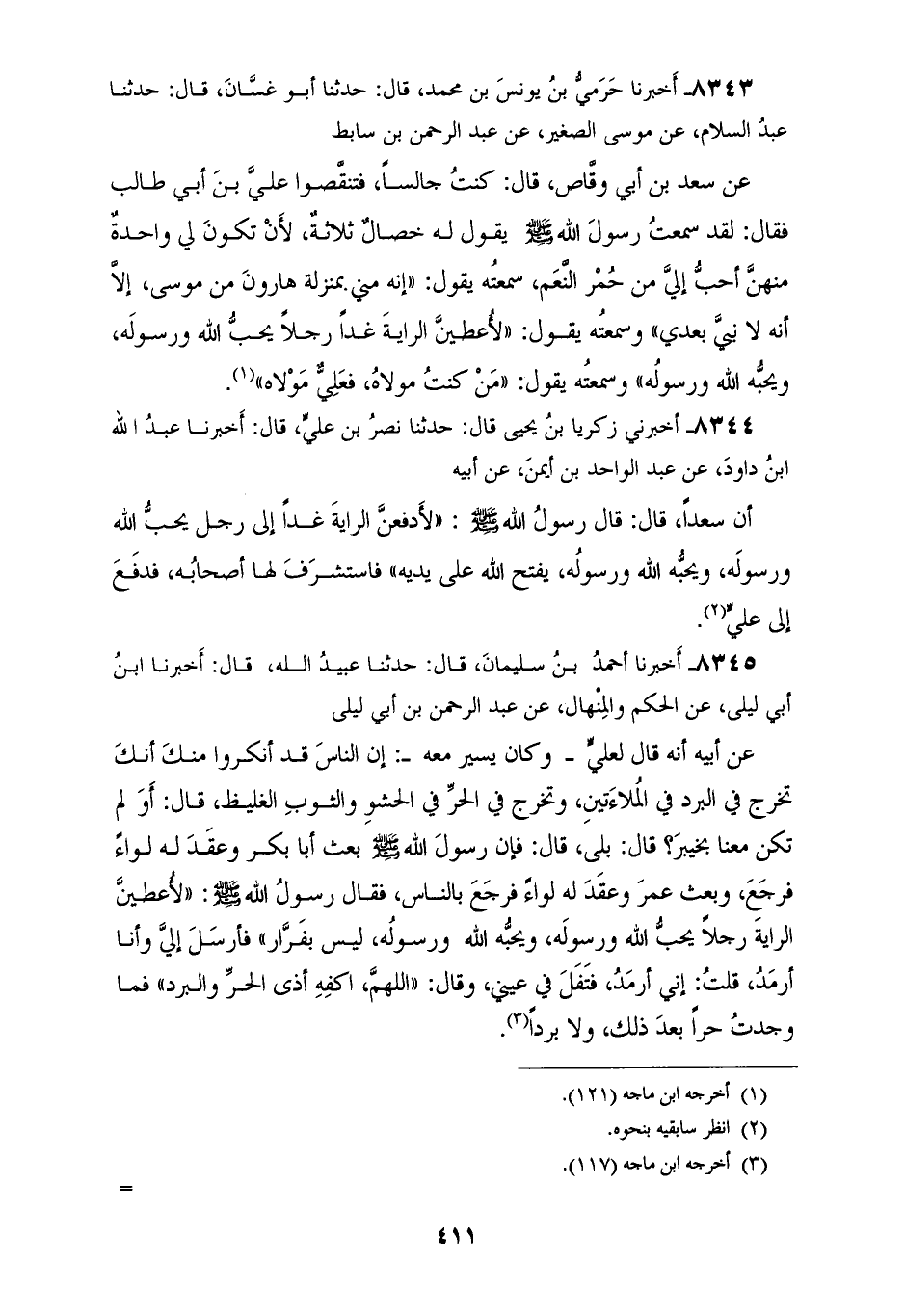 8343 - أَخْبَرَنَا حَرَمِيُّ بْنُ يُونُسَ بْنِ مُحَمَّدٍ قَالَ: حَدَّثَنَا أَبُو غَسَّانَ قَالَ: حَدَّثَنَا عَبْدُ السَّلَامِ، عَنْ مُوسَى الصَّغِيرِ، عَنْ عَبْدِ الرَّحْمَنِ بْنِ سَابِطٍ، عَنْ سَعْدِ بْنِ أَبِي وَقَّاصٍ قَالَ: كُنْتُ جَالِسًا فَتَنَقَصُّوا عَلِيَّ بْنَ أَبِي طَالِبٍ فَقَالَ: لَقَدْ سَمِعْتُ رَسُولَ اللهِ صَلَّى اللهُ عَلَيْهِ وَسَلَّمَ يَقُولُ لَهُ خِصَالٌ ثَلَاثَةٌ، لَأَنْ تَكُونَ لِي وَاحِدَةٌ مِنْهُنَّ أَحَبَّ إِلَيَّ مِنْ حُمْرِ النَّعَمِ، سَمِعَتْهُ يَقُولُ: «إِنَّهُ مِنِّي بِمَنْزِلَةِ هَارُونَ مِنْ مُوسَى، إِلَّا أَنَّهُ لَا نَبِيَّ بَعْدِي» وَسَمِعْتُهُ يَقُولُ: «§لَأُعْطِيَنَّ الرَّايَةَ غَدًا رَجُلًا يُحِبُّ اللهَ وَرَسُولَهُ، وَيُحِبُّهُ اللهُ وَرَسُولُهُ» وَسَمِعْتُهُ يَقُولُ: «مَنْ كُنْتُ مَوْلَاهُ فَعَلِيٌّ مَوْلَاهُ»