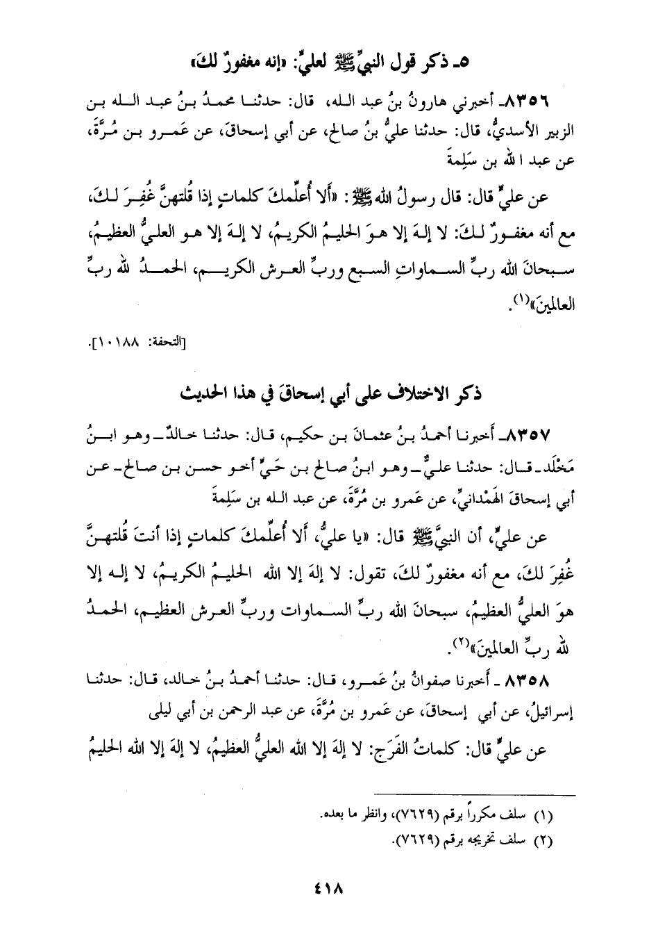8357 - أَخْبَرَنَا أَحْمَدُ بْنُ عُثْمَانَ بْنِ حَكِيمٍ قَالَ: حَدَّثَنَا خَالِدٌ وَهُوَ ابْنُ مَخْلَدٍ قَالَ: حَدَّثَنَا عَلِيٌّ وَهُوَ ابْنُ صَالِحِ بْنُ حَيٍّ أَخُو حَسَنِ بْنِ صَالِحٍ، عَنْ أَبِي إِسْحَاقَ الْهَمْدَانِيِّ، عَنْ عَمْرِو بْنِ مُرَّةَ، عَنْ عَبْدِ اللهِ بْنِ سَلَمَةَ، عَنْ عَلِيٍّ، أَنَّ النَّبِيَّ صَلَّى اللهُ عَلَيْهِ وَسَلَّمَ قَالَ: §يَا عَلِيُّ «أَلَا أُعَلِّمُكَ كَلِمَاتٍ إِذَا أَنْتَ قُلْتَهُنَّ غُفِرَ لَكَ مَعَ أَنَّهُ مَغْفُورٌ لَكَ؟» تَقُولُ: «لَا إِلَهَ إِلَّا اللهُ الْحَلِيمُ الْكَرِيمُ، لَا إِلَهَ إِلَّا هُوَ الْعَلِيُّ الْعَظِيمُ، سُبْحَانَ اللهِ رَبِّ السَّمَوَاتِ وَرَبِّ الْعَرْشِ الْعَظِيمِ، الْحَمْدُ لِلَّهِ رَبِّ الْعَالَمِينَ»