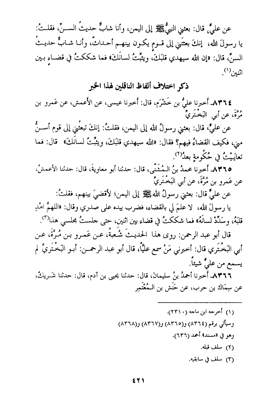 8365 - أَخْبَرَنَا مُحَمَّدُ بْنُ الْمُثَنَّى قَالَ: حَدَّثَنَا أَبُو مُعَاوِيَةَ قَالَ: حَدَّثَنَا الْأَعْمَشُ، عَنْ عَمْرِو بْنِ مُرَّةَ، عَنْ أَبِي الْبَخْتَرِيِّ، عَنْ عَلِيٍّ قَالَ: §بَعَثَنِي رَسُولُ اللهِ صَلَّى اللهُ عَلَيْهِ وَسَلَّمَ إِلَى الْيَمَنِ لِأَقْضِيَ بَيْنَهُمْ فَقُلْتُ: يَا رَسُولَ اللهِ لَا عِلْمَ لِي بِالْقَضَاءِ، فَضَرَبَ بِيَدِهِ عَلَى صَدْرِي وَقَالَ: «اللهُمَّ اهْدِ قَلْبَهُ، وَسَدِّدْ لِسَانَهُ» فَمَا شَكَكْتُ فِي قَضَاءٍ بَيْنَ اثْنَيْنِ حَتَّى جَلَسْتُ مَجْلِسِي هَذَا قَالَ أَبُو عَبْدِ الرَّحْمَنِ: رَوَى هَذَا الْحَدِيثَ شُعْبَةُ، عَنْ عَمْرِو بْنِ مُرَّةَ، عَنْ أَبِي الْبَخْتَرِيِّ قَالَ: أَخْبَرَنِي مَنْ سَمِعَ عَلِيًّا قَالَ أَبُو عَبْدِ الرَّحْمَنِ: أَبُو الْبَخْتَرِيِّ لَمْ يَسْمَعْ مِنْ عَلِيٍّ شَيْئًا