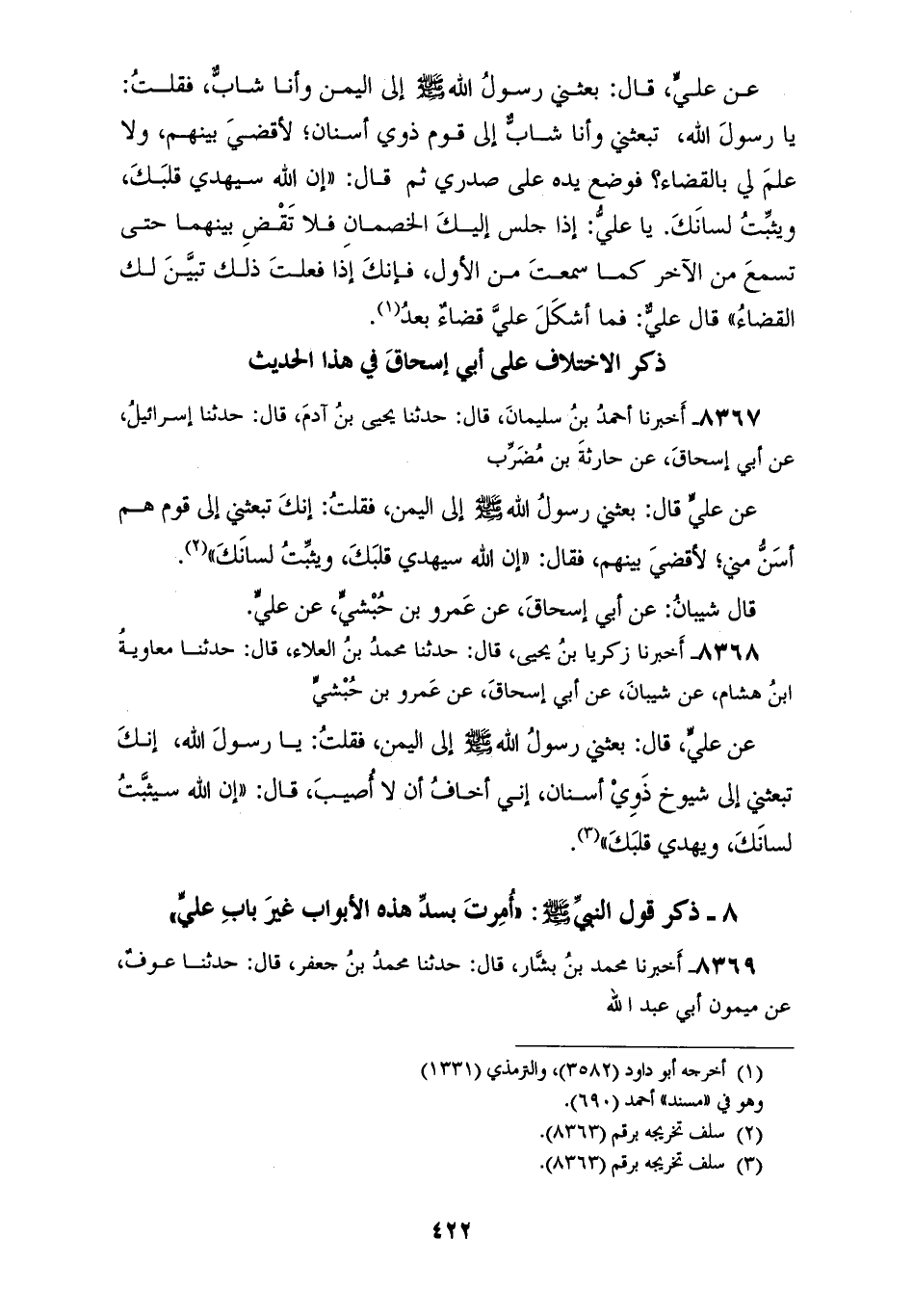 8367 - أَخْبَرَنَا أَحْمَدُ بْنُ سُلَيْمَانَ قَالَ: حَدَّثَنَا يَحْيَى بْنُ آدَمَ قَالَ: حَدَّثَنَا إِسْرَائِيلُ، عَنْ أَبِي إِسْحَاقَ، عَنْ حَارِثَةَ بْنِ مُضَرِّبٍ، عَنْ عَلِيٍّ قَالَ: §بَعَثَنِي رَسُولُ اللهِ صَلَّى اللهُ عَلَيْهِ وَسَلَّمَ إِلَى الْيَمَنِ فَقُلْتُ: «إِنَّكَ تَبْعَثُنِي إِلَى قَوْمٍ هُمْ أَسَنُّ مِنِّي لِأَقْضِيَ بَيْنَهُمْ» فَقَالَ: «إِنَّ اللهَ سَيَهْدِي قَلْبَكَ، وَيُثَبِّتُ لِسَانَكَ» قَالَ شَيْبَانُ عَنْ أَبِي إِسْحَاقَ، عَنْ عَمْرِو بْنِ حَبَشِيٍّ، عَنْ عَلِيٍّ