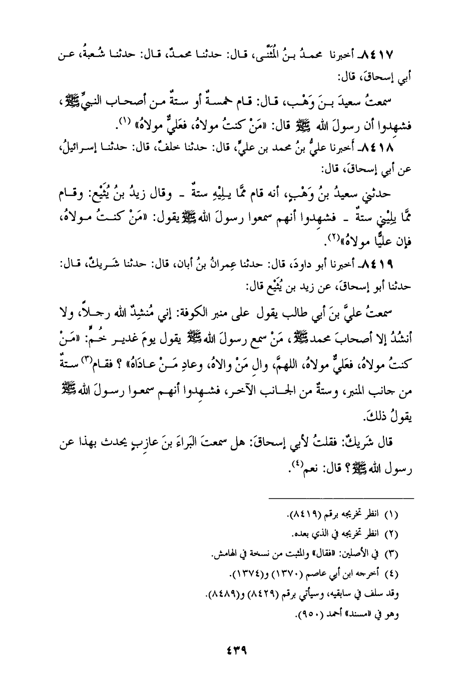 8419 - أَخْبَرَنَا أَبُو دَاوُدَ قَالَ: حَدَّثَنَا عِمْرَانُ بْنُ أَبَانَ قَالَ: حَدَّثَنَا شَرِيكٌ قَالَ: حَدَّثَنَا أَبُو إِسْحَاقَ، عَنْ زَيْدِ بْنِ يُثَيْعٍ قَالَ: سَمِعْتُ عَلِيَّ بْنَ أَبِي طَالِبٍ يَقُولُ عَلَى مِنْبَرِ الْكُوفَةِ: إِنِّي مُنْشِدٌ اللهَ رَجُلًا، وَلَا أَنْشُدُ إِلَّا أَصْحَابَ مُحَمَّدٍ صَلَّى اللهُ عَلَيْهِ وَسَلَّمَ، مَنْ سَمِعَ رَسُولَ اللهِ صَلَّى اللهُ عَلَيْهِ وَسَلَّمَ يَقُولُ " يَوْمَ غَدِيرٍ خُمٍّ: «§مَنْ كُنْتُ مَوْلَاهُ فَعَلِيٌّ مَوْلَاهُ، اللهُمَّ وَالِ مَنْ وَالَاهُ، وَعَادِ مَنْ عَادَاهُ؟». فَقَامَ سِتَّةٌ مِنْ جَانِبِ الْمِنْبَرِ، وَسِتَّةٌ مِنَ الْجَانِبِ الْآخَرِ، فَشَهِدُوا أَنَّهُمْ سَمِعُوا رَسُولَ اللهِ صَلَّى اللهُ عَلَيْهِ وَسَلَّمَ يَقُولُ ذَلِكَ " قَالَ شَرِيكٌ: فَقُلْتُ لِأَبِي إِسْحَاقَ: هَلْ سَمِعْتَ الْبَرَاءَ بْنَ عَازِبٍ يُحَدِّثُ بِهَذَا عَنْ رَسُولِ اللهِ صَلَّى اللهُ عَلَيْهِ وَسَلَّمَ؟ قَالَ: «نَعَمْ»