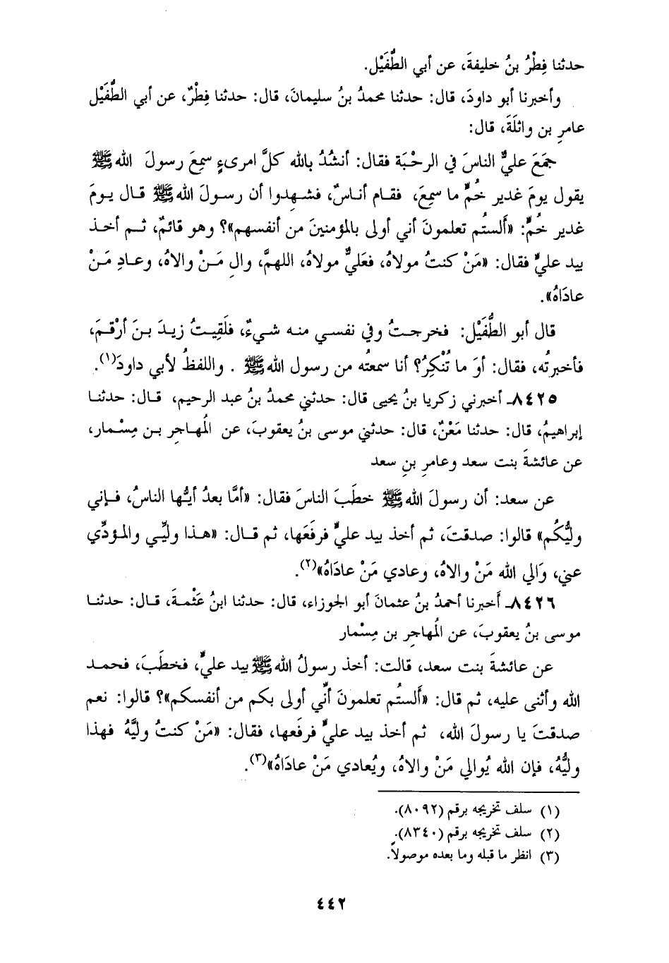 8424 - أَخْبَرَنِي هَارُونُ بْنُ عَبْدِ اللهِ قَالَ: حَدَّثَنَا مُصْعَبُ بْنُ الْمِقْدَامِ قَالَ: حَدَّثَنَا فِطْرُ بْنُ خَلِيفَةَ، عَنْ أَبِي الطُّفَيْلِ، وَأَخْبَرَنَا أَبُو دَاوُدَ قَالَ: حَدَّثَنَا مُحَمَّدُ بْنُ سُلَيْمَانَ قَالَ: حَدَّثَنَا فِطْرٌ، عَنْ أَبِي الطُّفَيْلِ عَامِرِ بْنِ وَاثِلَةَ قَالَ: جَمَعَ عَلِيٌّ النَّاسَ فِي الرَّحْبَةِ فَقَالَ: «أَنْشُدُ بِاللهِ كُلَّ امْرِئٍ سَمِعَ رَسُولَ اللهِ صَلَّى اللهُ عَلَيْهِ وَسَلَّمَ يَقُولُ يَوْمَ غَدِيرِ خُمٍّ مَا سَمِعَ، فَقَامَ أُنَاسٌ فَشَهِدُوا أَنَّ رَسُولَ اللهِ صَلَّى اللهُ عَلَيْهِ وَسَلَّمَ» قَالَ يَوْمَ غَدِيرِ خُمٍّ: «§أَلَسْتُمْ تَعْلَمُونَ أَنِّي أَوْلَى بِالْمُؤْمِنِينَ مِنْ أَنْفُسِهِمْ؟، وَهُوَ قَائِمٌ، ثُمَّ أَخَذَ بِيَدِ عَلِيٍّ» فَقَالَ: «مَنْ كُنْتُ مَوْلَاهُ فَعَلِيٌّ مَوْلَاهُ اللهُمَّ وَالِ مَنْ وَالَاهُ، وَعَادِ مَنْ عَادَاهُ» قَالَ أَبُو الطُّفَيْلِ: «فَخَرَجْتُ وَفِي نَفْسِي مِنْهُ شَيْءٌ، فَلَقِيتُ زَيْدَ بْنَ أَرْقَمَ، فَأَخْبَرْتُهُ» فَقَالَ: «أَوَمَا تُنْكِرُ؟ أَنَا سَمِعْتُهُ مِنْ رَسُولِ اللهِ صَلَّى اللهُ عَلَيْهِ وَسَلَّمَ» وَاللَّفْظُ لِأَبِي دَاوُدَ