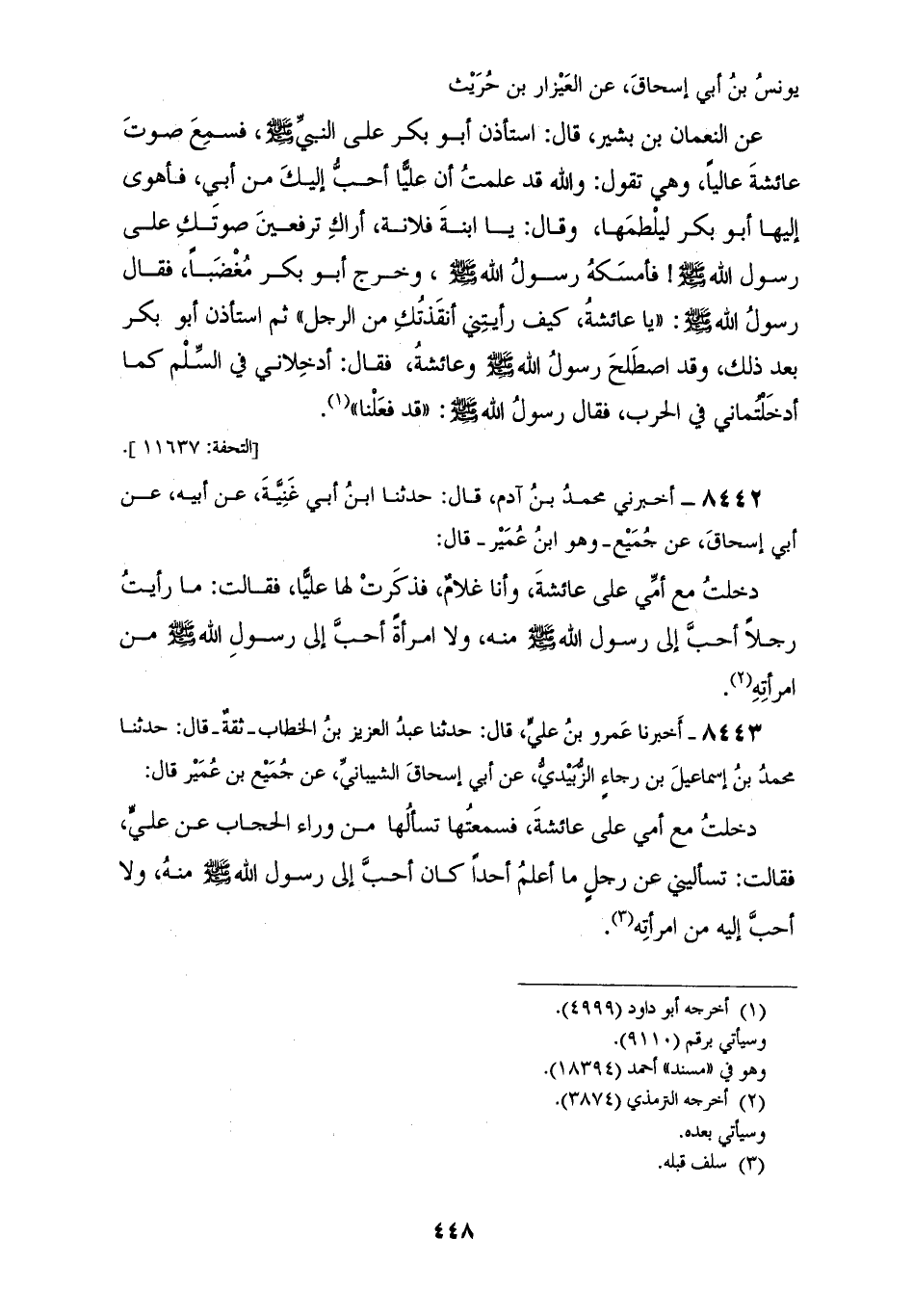 8441 - أَخْبَرَنِي عَبْدَةُ بْنُ عَبْدِ الرَّحِيمِ قَالَ: أَخْبَرَنَا عَمْرُو بْنُ مُحَمَّدٍ قَالَ: أَخْبَرَنَا يُونُسُ بْنُ أَبِي إِسْحَاقَ، عَنِ الْعَيْزَارِ بْنِ حُرَيْثِ، عَنِ النُّعْمَانِ بْنِ بَشِيرٍ قَالَ: §اسْتَأْذَنَ أَبُو بَكْرٍ عَلَى النَّبِيِّ صَلَّى اللهُ عَلَيْهِ وَسَلَّمَ، فَسَمِعَ صَوْتَ عَائِشَةَ عَالِيًا، وَهِيَ تَقُولُ: «وَاللهِ قَدْ عَلِمْتُ أَنَّ عَلِيًّا أَحَبُّ إِلَيْكِ مِنْ أَبِي، فَأَهْوَى إِلَيْهَا أَبُو بَكْرٍ لِيَلْطِمَهَا» وَقَالَ: يَا ابْنَةَ فُلَانَةَ «أَرَاكِ تَرْفَعِينَ صَوْتَكِ عَلَى رَسُولِ اللهِ صَلَّى اللهُ عَلَيْهِ وَسَلَّمَ فَأَمْسَكَهُ رَسُولُ اللهِ صَلَّى اللهُ عَلَيْهِ وَسَلَّمَ، وَخَرَجَ أَبُو بَكْرٍ مُغْضَبًا» فَقَالَ رَسُولُ اللهِ صَلَّى اللهُ عَلَيْهِ وَسَلَّمَ: يَا عَائِشَةُ «كَيْفَ رَأَيْتِنِي أَنْقَذْتُكِ مِنَ الرَّجُلِ؟» ثُمَّ اسْتَأْذَنَ أَبُو بَكْرٍ بَعْدَ ذَلِكَ، وَقَدِ اصْطَلَحَ رَسُولُ اللهِ صَلَّى اللهُ عَلَيْهِ وَسَلَّمَ وَعَائِشَةُ فَقَالَ: «أَدْخِلَانِي فِي السِّلْمِ كَمَا أَدْخَلْتُمَانِي فِي الْحَرْبِ» فَقَالَ رَسُولُ اللهِ صَلَّى اللهُ عَلَيْهِ وَسَلَّمَ: «قَدْ فَعَلْنَا»