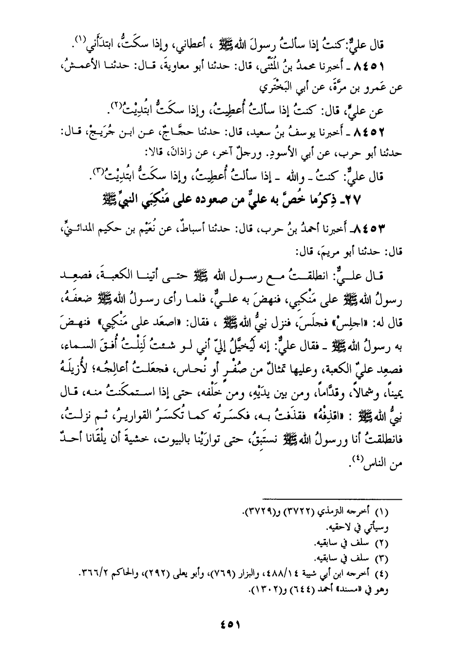 8453 - أَخْبَرَنَا أَحْمَدُ بْنُ حَرْبٍ قَالَ: حَدَّثَنَا أَسْبَاطٌ، عَنْ نُعَيْمِ بْنِ حَكِيمٍ الْمَدَائِنِيِّ قَالَ: حَدَّثَنَا أَبُو مَرْيَمَ قَالَ: قَالَ عَلِيٌّ: «§انْطَلَقْتُ مَعَ رَسُولِ اللهِ صَلَّى اللهُ عَلَيْهِ وَسَلَّمَ حَتَّى أَتَيْنَا الْكَعْبَةَ، فَصَعِدَ رَسُولُ اللهِ صَلَّى اللهُ عَلَيْهِ وَسَلَّمَ عَلَى مَنْكِبَيَّ، فَنَهَضَ بِهِ عَلِيٌّ» فَلَمَّا رَأَى رَسُولُ اللهِ صَلَّى اللهُ عَلَيْهِ وَسَلَّمَ ضَعْفَهُ قَالَ لَهُ: «اجْلِسْ، فَجَلَسَ، فَنَزَلَ نَبِيُّ اللهِ صَلَّى اللهُ عَلَيْهِ وَسَلَّمَ» فَقَالَ: «اصْعَدْ عَلَى مَنْكِبَيَّ» فَنَهَضَ بِهِ رَسُولُ اللهِ صَلَّى اللهُ عَلَيْهِ وَسَلَّمَ فَقَالَ عَلِيٌّ: «إِنَّهُ لَيُخَيَّلُ إِلَيَّ أَنِّي لَوْ شِئْتُ لَنِلْتُ أُفُقَ السَّمَاءِ، فَصَعِدَ عَلِيٌّ الْكَعْبَةِ وَعَلَيْهَا تِمْثَالٌ مِنْ صُفْرٍ أَوْ نُحَاسٍ، فَجَعَلْتُ أُعَالِجُهُ لَأُزِيلَهُ يَمِينًا وَشِمَالًا، وَقُدَّامًا وَمِنْ بَيْنِ يَدَيْهِ، وَمِنْ خَلْفِهِ، حَتَّى إِذَا اسْتَمْكَنْتُ مِنْهُ» قَالَ نَبِيُّ اللهِ صَلَّى اللهُ عَلَيْهِ وَسَلَّمَ: «اقْذِفْهُ» فَقَذَفْتُ بِهِ، فَكَسَرْتُهُ كَمَا تُكْسَرُ الْقَوَارِيرُ، ثُمَّ نَزَلْتُ، فَانْطَلَقْتُ أَنَا وَرَسُولُ اللهِ صَلَّى اللهُ عَلَيْهِ وَسَلَّمَ نَسْتَبِقُ حَتَّى تَوَارَيْنَا بِالْبُيُوتِ خَشْيَةَ أَنْ يَلْقَانَا أَحَدٌ مِنَ النَّاسِ "