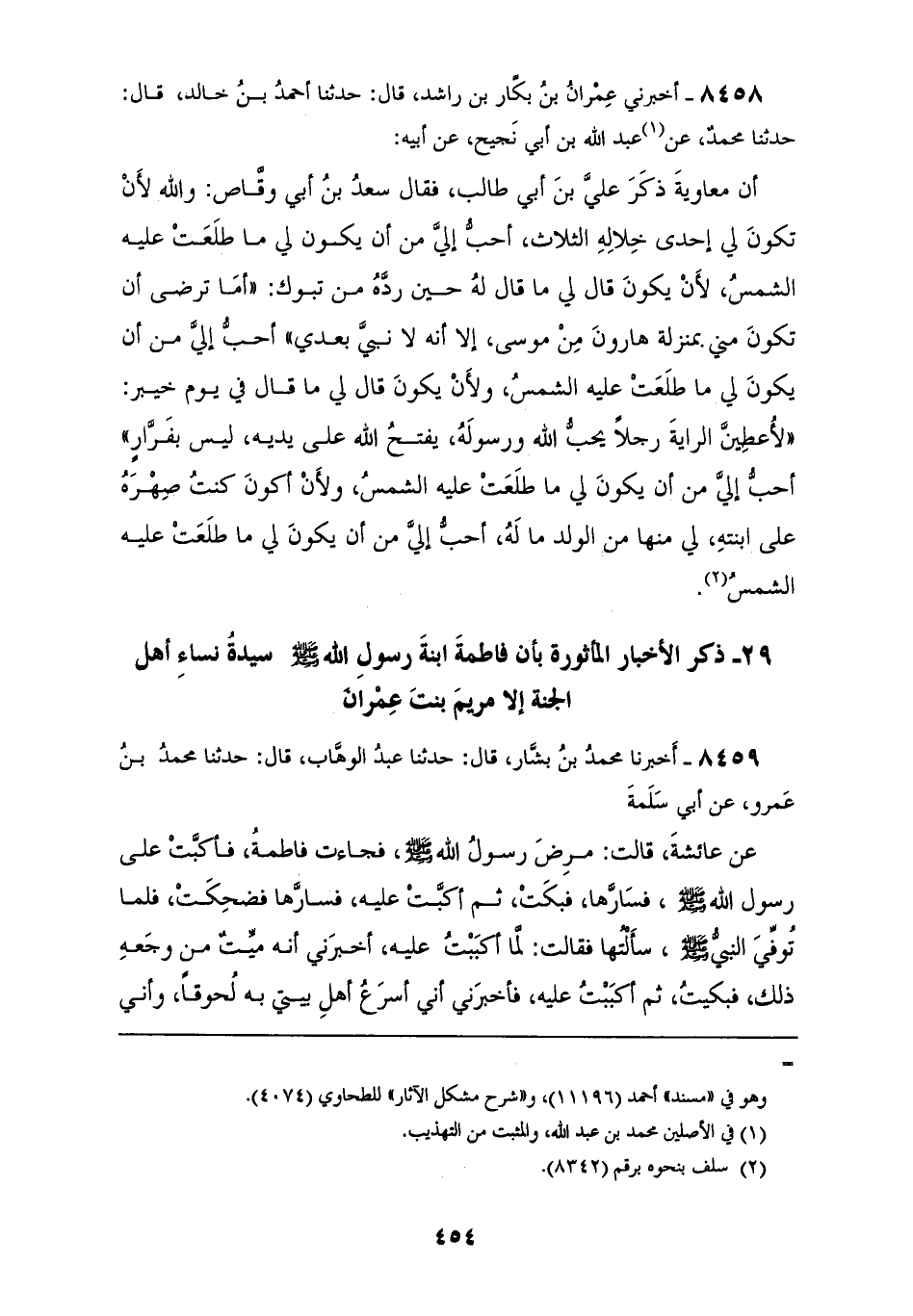 8458 - أَخْبَرَنِي عِمْرَانُ بْنُ بَكَّارِ بْنِ رَاشِدٍ قَالَ: حَدَّثَنَا أَحْمَدُ بْنُ خَالِدٍ قَالَ: حَدَّثَنَا مُحَمَّدٌ، عَنْ عَبْدِ اللهِ بْنِ أَبِي نَجِيحٍ، عَنْ أَبِيهِ، أَنَّ مُعَاوِيَةَ، ذَكَرَ عَلِيَّ بْنَ أَبِي طَالِبٍ فَقَالَ سَعْدُ بْنُ أَبِي وَقَّاصٍ: «§وَاللهِ لَأَنْ تَكُونَ لِي إِحْدَى خِلَالِهِ الثَّلَاثِ أَحَبُّ إِلَيَّ مِنْ أَنْ يَكُونَ لِي مَا طَلَعَتْ عَلَيْهِ الشَّمْسُ لَأَنْ يَكُونَ» قَالَ لِي مَا قَالَ لَهُ حِينَ رَدَّهُ مِنْ تَبُوكَ: «أَمَا تَرْضَى أَنْ تَكُونَ مِنِّي بِمَنْزِلَةِ هَارُونَ مِنْ مُوسَى إِلَّا أَنَّهُ لَا نَبِيَّ بَعْدِي؟» أَحَبُّ إِلَيَّ مِنْ أَنْ يَكُونَ لِي مَا طَلَعَتْ عَلَيْهِ الشَّمْسُ، وَلِأَنْ يَكُونَ قَالَ لِي مَا قَالَ فِي يَوْمِ خَيْبَرَ: «لَأُعْطِيَنَّ الرَّايَةَ رَجُلًا يُحِبُّ اللهَ وَرَسُولَهُ، يَفْتَحُ اللهُ عَلَى يَدَيْهِ، لَيْسَ بِفَرَّارٍ، أَحَبُّ إِلَيَّ مِنْ أَنْ يَكُونَ لِي مَا طَلَعَتْ عَلَيْهِ الشَّمْسُ، وَلِأَنْ أَكُونَ كُنْتُ صِهْرَهُ عَلَى ابْنَتِهِ لِي مِنْهَا مِنَ الْوَلَدِ مَا لَهُ أَحَبُّ إِلَيَّ مِنْ أَنْ يَكُونَ لِي مَا طَلَعَتْ عَلَيْهِ الشَّمْسُ»