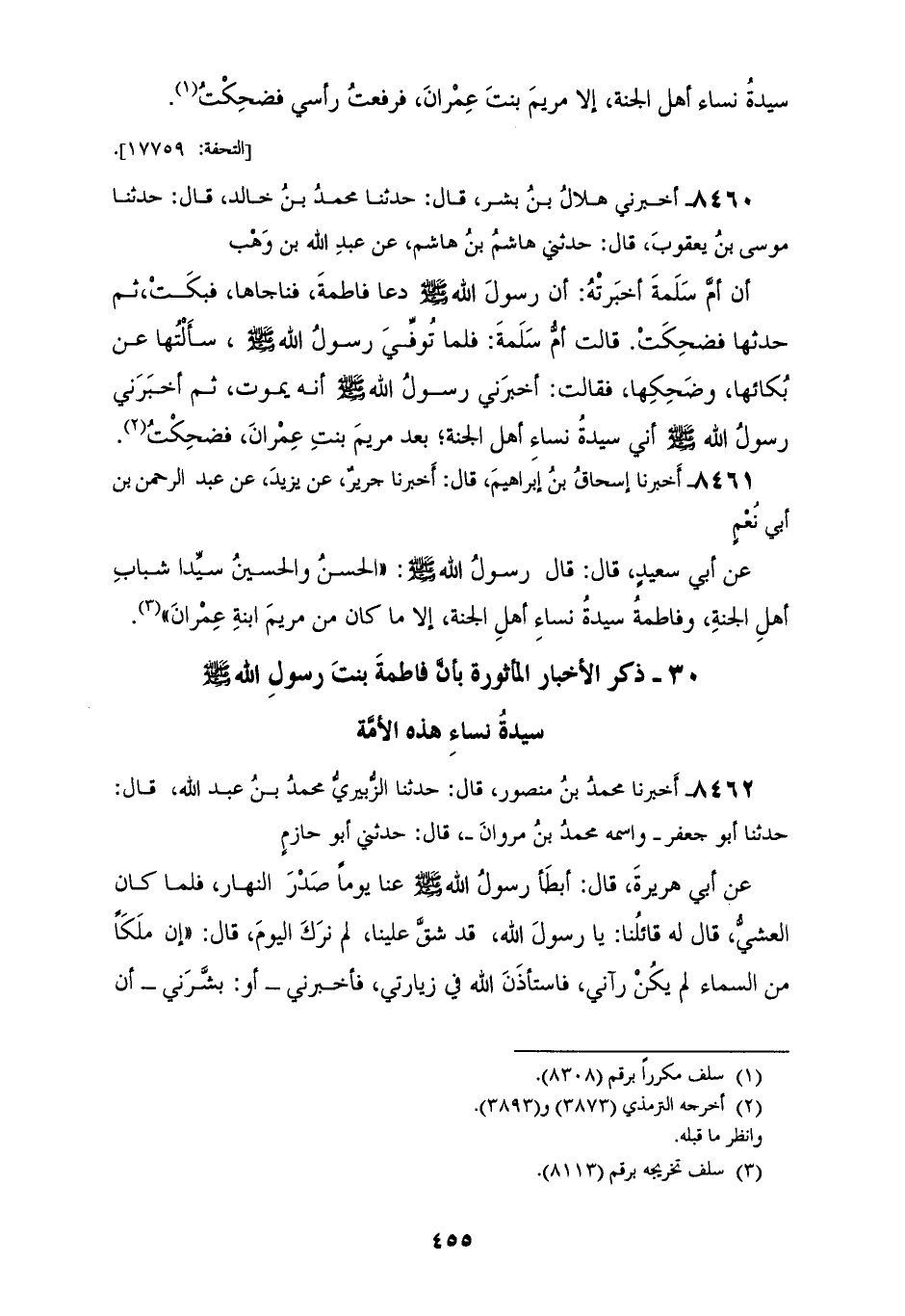8460 - أَخْبَرَنِي هِلَالُ بْنُ بِشْرٍ قَالَ: حَدَّثَنَا مُحَمَّدُ بْنُ خَالِدٍ قَالَ: حَدَّثَنَا مُوسَى بْنُ يَعْقُوبَ قَالَ: حَدَّثَنِي هَاشِمُ بْنُ هَاشِمٍ، عَنْ عَبْدِ اللهِ بْنِ وَهْبٍ، أَنَّ أُمَّ سَلَمَةَ، أَخْبَرَتْهُ أَنَّ رَسُولَ اللهِ صَلَّى اللهُ عَلَيْهِ وَسَلَّمَ «§دَعَا فَاطِمَةَ، فَنَاجَاهَا، فَبَكَتْ، ثُمَّ حَدَّثَهَا فَضَحِكَتْ» قَالَتْ أُمُّ سَلَمَةَ: «فَلَمَّا تُوُفِّيَ رَسُولُ اللهِ صَلَّى اللهُ عَلَيْهِ وَسَلَّمَ سَأَلْتُهَا عَنْ بُكَائِهَا، وَضَحِكِهَا» فَقَالَتْ: «أَخْبَرَنِي رَسُولُ اللهِ صَلَّى اللهُ عَلَيْهِ وَسَلَّمَ أَنَّهُ يَمُوتُ، ثُمَّ أَخْبَرَنِي رَسُولُ اللهِ صَلَّى اللهُ عَلَيْهِ وَسَلَّمَ أَنِّي سَيِّدَةُ نِسَاءِ أَهْلِ الْجَنَّةِ بَعْدَ مَرْيَمَ بِنْتِ عِمْرَانَ فَضَحِكْتُ»