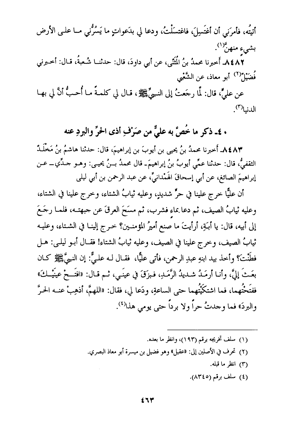 8483 - أَخْبَرَنَا مُحَمَّدُ بْنُ يَحْيَى بْنُ أَيُّوبَ بْنِ إِبْرَاهِيمَ قَالَ: حَدَّثَنَا هَاشِمُ بْنُ مَخْلَدٍ الثَّقَفِيُّ قَالَ: حَدَّثَنَا عَمِّي أَيُّوبُ بْنُ إِبْرَاهِيمَ قَالَ مُحَمَّدُ بْنُ يَحْيَى وَهُوَ جَدِّي، عَنْ إِبْرَاهِيمَ الصَّائِغِ، عَنْ أَبِي إِسْحَاقَ الْهَمْدَانِيِّ، عَنْ عَبْدِ الرَّحْمَنِ بْنِ أَبِي لَيْلَى، أَنَّ عَلِيًّا §خَرَجَ عَلَيْنَا فِي حَرٍّ شَدِيدٍ، وَعَلَيْهِ ثِيَابُ الشِّتَاءِ، وَخَرَجَ عَلَيْنَا فِي الشِّتَاءِ، وَعَلَيْهِ ثِيَابُ الصَّيْفِ، ثُمَّ دَعَا بِمَاءٍ فَشَرِبَ، ثُمَّ مَسَحَ الْعَرَقَ عَنْ جَبْهَتِهِ، فَلَمَّا رَجَعَ إِلَى أَبِيهِ قَالَ: يَا أَبَةِ «أَرَأَيْتَ مَا صَنَعَ أَمِيرُ الْمُؤْمِنِينَ؟ خَرَجَ إِلَيْنَا فِي الشِّتَاءِ، وَعَلَيْهِ ثِيَابُ الصَّيْفِ، وَخَرَجَ عَلَيْنَا فِي الصَّيْفِ، وَعَلَيْهِ ثِيَابُ الشِّتَاءِ» فَقَالَ أَبُو لَيْلَى: هَلْ فَطِنْتَ؟ وَأَخَذَ بِيَدِ ابْنِهِ عَبْدِ الرَّحْمَنِ، فَأَتَى عَلِيًّا فَقَالَ لَهُ عَلِيٌّ: إِنَّ النَّبِيَّ صَلَّى اللهُ عَلَيْهِ وَسَلَّمَ كَانَ بَعَثَ إِلَيَّ، وَأنا أَرْمَدُ شَدِيدُ الرَّمَدِ، فَبَزَقَ فِي عَيْنِي ثُمَّ قَالَ: «افْتَحْ عَيْنَيْكَ فَفَتَحْتُهُمَا، فَمَا اشْتَكَيْتُهُمَا حَتَّى السَّاعَةِ، وَدَعَا لِي» فَقَالَ: «اللهُمَّ أَذْهِبْ عَنْهُ الْحَرَّ وَالْبَرَدَ، فَمَا وَجَدْتُ حَرًّا، وَلَا بَرْدًا حَتَّى يَوْمِي هَذَا»