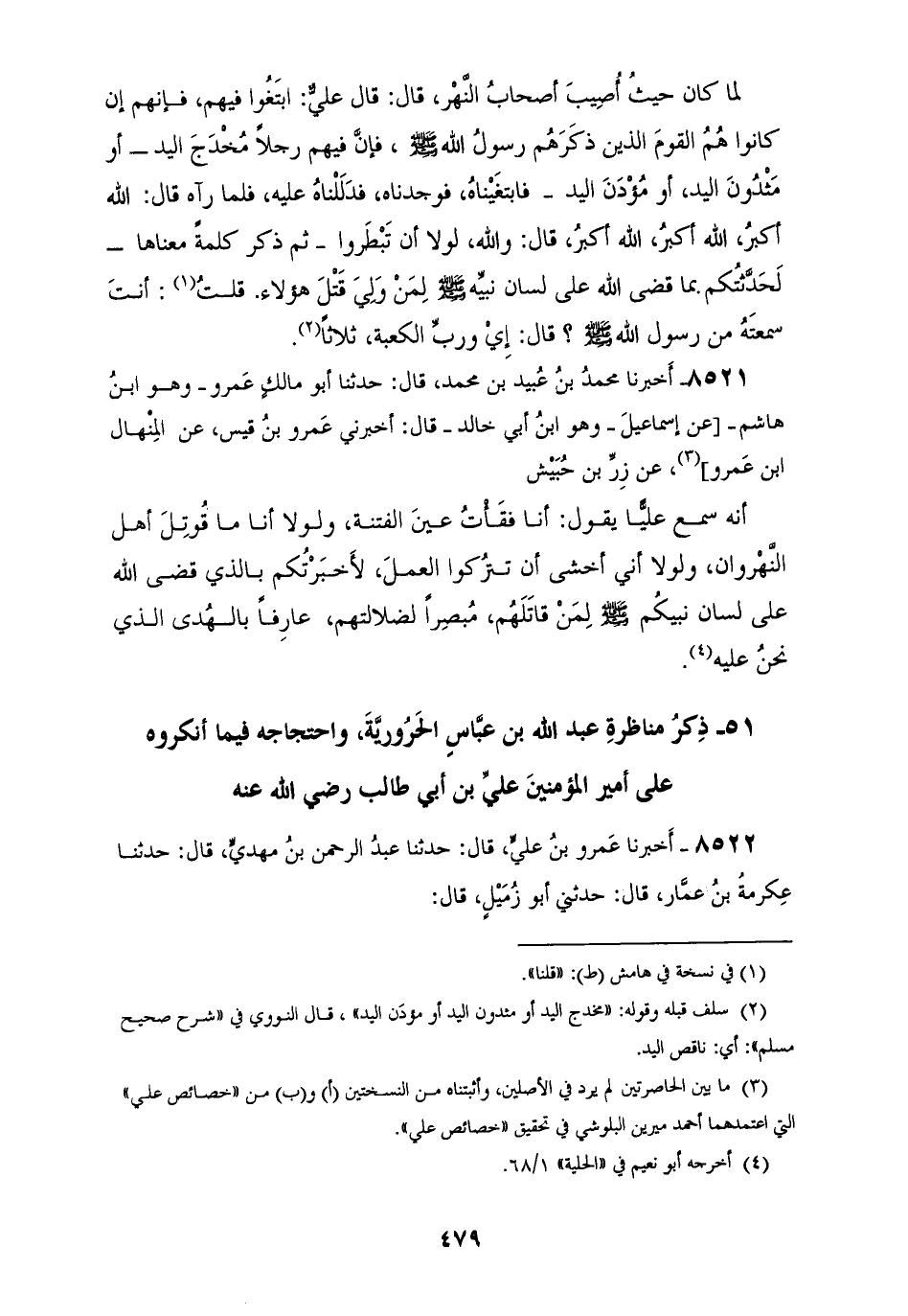 8520 - أَخْبَرَنَا إِسْمَاعِيلُ بْنُ مَسْعُودٍ قَالَ: حَدَّثَنَا الْمُعْتَمِرُ بْنُ سُلَيْمَانَ، عَنْ عَوْفٍ قَالَ: حَدَّثَنَا مُحَمَّدُ بْنُ سِيرِينَ قَالَ: قَالَ عُبَيْدَةُ السَّلْمَانِيُّ لَمَّا كَانَ حَيْثُ §أُصِيبَ أَصْحَابُ النَّهَرِ قَالَ: قَالَ عَلِيٌّ: «ابْتَغُوا فِيهِمْ، فَإِنَّهُمْ إِنْ كَانُوا هُمُ الْقَوْمُ الَّذِينَ ذَكَرَهُمْ رَسُولُ اللهِ صَلَّى اللهُ عَلَيْهِ وَسَلَّمَ، فَإِنَّ فِيهِمْ رَجُلًا مُخْدَجَ الْيَدِ، أَوْ مَثْدُونَ الْيَدِ، أَوْ مُؤْدَنَ الْيَدِ» فَابْتَغَيْنَاهُ، فَوَجَدْنَاهُ، فَدَلَلْنَاهُ عَلَيْهِ، فَلَمَّا رَآهُ قَالَ: «اللهُ أَكْبَرُ، اللهُ أَكْبَرُ، اللهُ أَكْبَرُ» قَالَ: «وَاللهِ، لَوْلَا أَنْ تَبْطَرُوا، ثُمَّ ذَكَرَ كَلِمَةً مَعْنَاهَا لَحَدَّثْتُكُمْ بِمَا قَضَى الله عَلَى لِسَانِ نَبِيِّهِ صَلَّى اللهُ عَلَيْهِ وَسَلَّمَ لِمَنْ وَلِيَ قَتْلَ هَؤُلَاءِ» قُلْتُ: أَنْتَ سَمِعْتَهُ مِنْ رَسُولِ اللهِ صَلَّى اللهُ عَلَيْهِ وَسَلَّمَ؟ قَالَ: «إِي وَرَبِّ الْكَعْبَةِ، ثَلَاثًا»