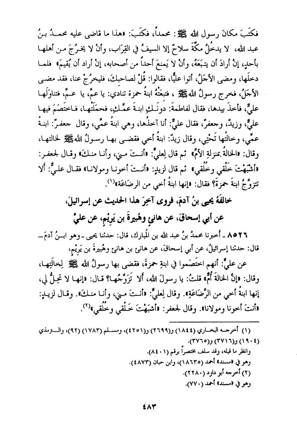 8525 - أَخْبَرَنَا أَحْمَدُ بْنُ سُلَيْمَانَ قَالَ: حَدَّثَنَا عُبَيْدُ اللهِ بْنُ مُوسَى قَالَ: أَخْبَرَنَا إِسْرَائِيلُ، عَنْ أَبِي إِسْحَاقَ، عَنِ الْبَرَاءِ بْنِ عَازِبٍ قَالَ: §اعْتَمَرَ رَسُولُ اللهِ صَلَّى اللهُ عَلَيْهِ وَسَلَّمَ فِي ذِي الْقَعْدَةِ، فَأَبَى أَهْلُ مَكَّةَ أَنْ يَدَعُوهُ يَدْخُلُ مَكَّةَ، حَتَّى قَاضَاهُمْ عَلَى أَنْ يُقِيمَ فِيهَا ثَلَاثَةَ أَيَّامٍ، فَلَمَّا كَتَبُوا الْكِتَابَ كَتَبُوا: هَذَا مَا قَاضَى عَلَيْهِ مُحَمَّدٌ رَسُولُ اللهِ " قَالُوا: " لَا نُقِرُّ بِهَا، لَوْ نَعْلَمُ أَنَّكَ رَسُولُ اللهِ مَا مَنَعْنَاكَ بَيْتَهُ، وَلَكِنْ أَنْتَ مُحَمَّدُ بْنُ عَبْدِ اللهِ قَالَ: أَنَا رَسُولُ اللهِ، وَأنا مُحَمَّدُ بْنُ عَبْدِ اللهِ قَالَ: لِعَلِيٍّ: «امْحُ رَسُولَ اللهِ صَلَّى اللهُ عَلَيْهِ وَسَلَّمَ» قَالَ: «وَاللهِ لَا أَمْحُوكَ أَبَدًا، فَأَخَذَ رَسُولُ اللهِ صَلَّى اللهُ عَلَيْهِ وَسَلَّمَ الْكِتَابَ، وَلَيْسَ يُحْسِنُ يَكْتُبُ، فَكَتَبَ مَكَانَ رَسُولِ اللهِ صَلَّى اللهُ عَلَيْهِ وَسَلَّمَ مُحَمَّدًا، فَكَتَبَ هَذَا مَا قَاضَى عَلَيْهِ مُحَمَّدُ بْنُ عَبْدِ اللهِ، لَا يَدْخُلُ مَكَّةَ سِلَاحٌ إِلَّا السَّيْفَ فِي الْقِرَابِ، وَأَنْ لَا يَخْرُجَ مِنْ أَهْلِهَا بِأَحَدٍ إِنْ أَرَادَ أَنْ يُتْبِعَهُ، وَأَنْ لَا يَمْنَعَ أَحَدًا مِنْ أَصْحَابِهِ إِنْ أَرَادَ أَنْ يُقِيمَ» فَلَمَّا دَخَلَهَا، وَمَضَى الْأَجَلُ أَتَوْا عَلِيًّا فَقَالُوا: قُلْ لِصَاحِبِكَ فَلْيَخْرُجْ عَنَّا، فَقَدْ مَضَى الْأَجَلُ، فَخَرَجَ رَسُولُ اللهِ صَلَّى اللهُ عَلَيْهِ وَسَلَّمَ فَتَبِعَتْهُ ابْنَةُ حَمْزَةَ تُنَادِي يَا عَمُّ يَا عَمُّ فَتَنَاوَلَهَا عَلِيٌّ، فَأَخَذَ بِيَدِهَا فَقَالَ لِفَاطِمَةَ: «دُونَكِ ابْنَةَ عَمِّكِ، فَحَمَلَتْهَا، فَاخْتَصَمَ فِيهَا عَلِيٌّ، وَزِيدٌ، وَجَعْفَرٌ» فَقَالَ عَلِيٌّ: «أَنَا آخُذُهَا، وَهِيَ ابْنَةُ عَمِّي» وَقَالَ جَعْفَرٌ: «ابْنَةُ عَمِّي، وَخَالَتُهَا تَحْتِي» وَقَالَ زَيْدٌ: «ابْنَةُ أَخِي، فَقَضَى بِهَا رَسُولُ اللهِ صَلَّى اللهُ عَلَيْهِ وَسَلَّمَ لِخَالَتِهَا» وَقَالَ: «الْخَالَةُ بِمَنْزِلَةِ الْأُمِّ» ثُمَّ قَالَ: لِعَلِيٍّ: «أَنْتَ مِنِّي، وَأَنَا مِنْكَ» وَقَالَ: لِجَعْفَرٍ «أَشْبَهْتَ خَلْقِي وَخُلُقِي» ثُمَّ قَالَ: لِزَيْدٍ: «أَنْتَ أَخُونَا وَمَوْلَانَا» فَقَالَ عَلِيٌّ: «أَلَا تَتَزَوَّجُ ابْنَةَ حَمْزَةَ؟» فَقَالَ: «إِنَّهَا ابْنَةُ أَخِي مِنَ الرَّضَاعَةِ» خَالَفَهُ يَحْيَى بْنُ آدَمَ، فَرَوَى آخَرُ هَذَا الْحَدِيثَ، عَنْ إِسْرَائِيلَ، عَنْ أَبِي إِسْحَاقَ، عَنْ هَانِئٍ وَهُبَيْرَةَ بْنِ يَرِيمَ، عَنْ عَلِيٍّ