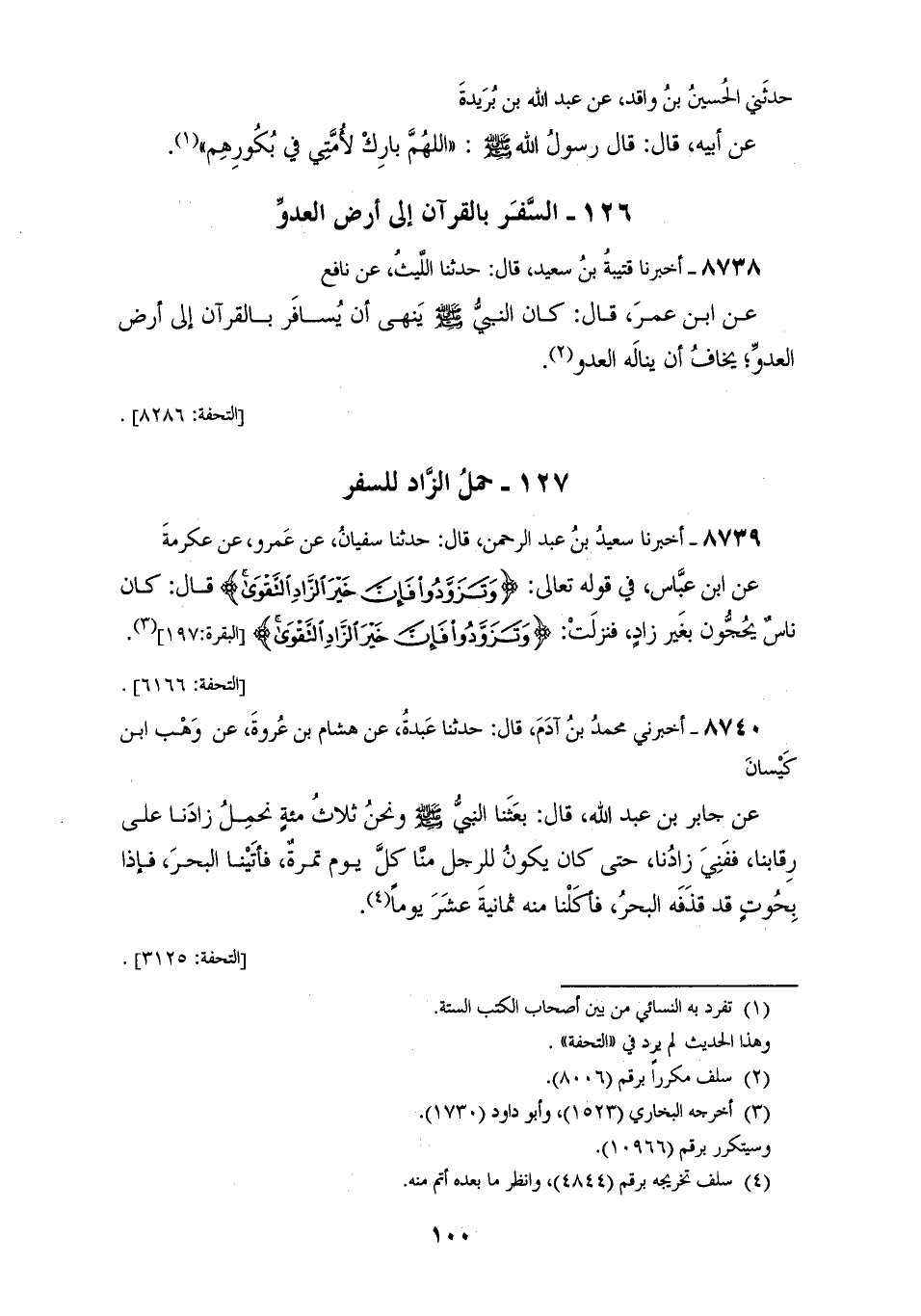 8738 - أَخْبَرَنَا قُتَيْبَةُ بْنُ سَعِيدٍ قَالَ: حَدَّثَنَا اللَّيْثُ، عَنْ نَافِعٍ، عَنِ ابْنِ عُمَرَ قَالَ: كَانَ النَّبِيُّ صَلَّى اللهُ عَلَيْهِ وَسَلَّمَ «§يُنْهَى أَنْ يُسَافَرَ بِالْقُرْآنِ إِلَى أَرْضِ الْعَدُوِّ، يُخَافُ أَنْ يَنَالَهُ الْعَدُوُّ»