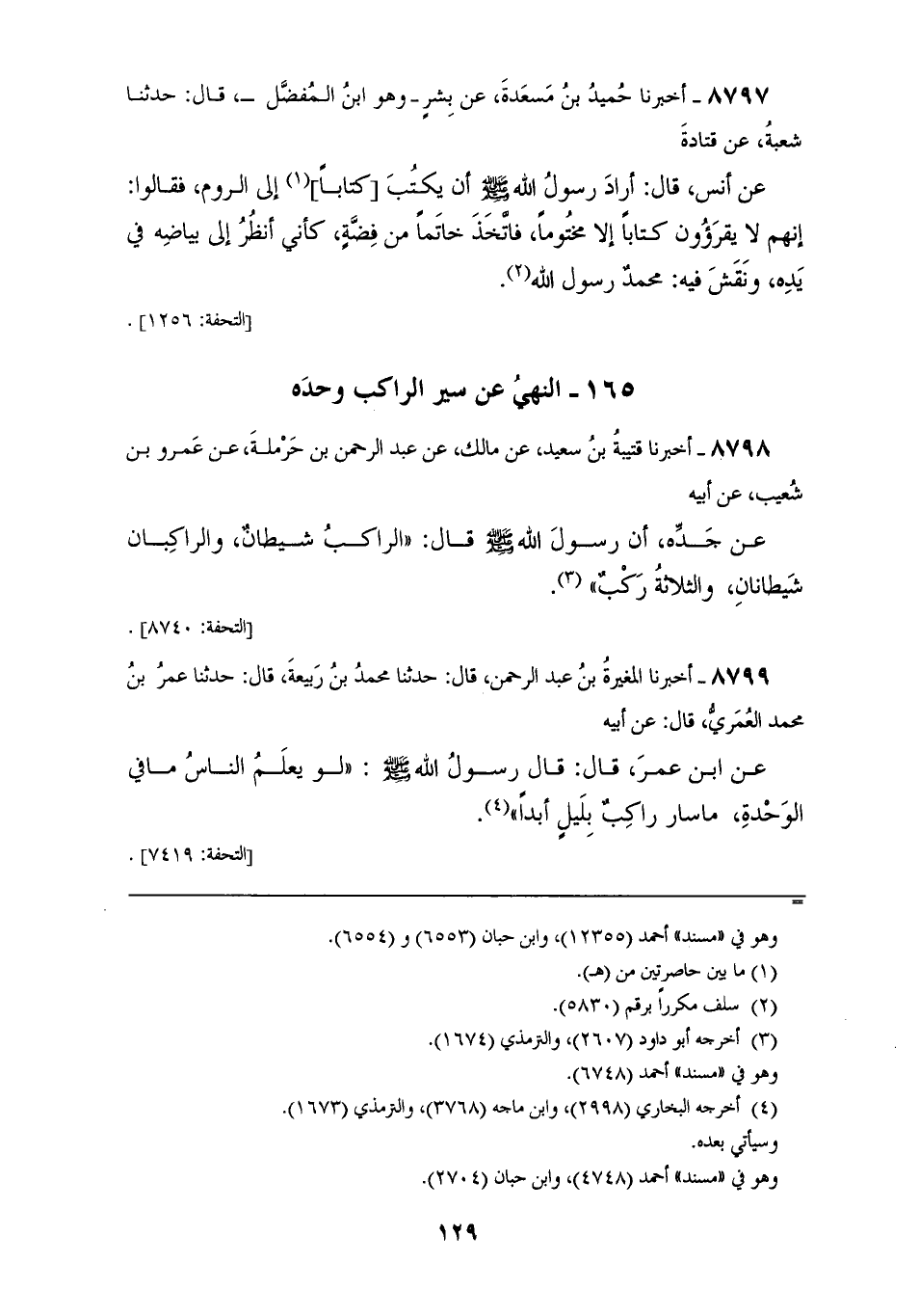 8798 - أَخْبَرَنَا قُتَيْبَةُ بْنُ سَعِيدٍ، عَنْ مَالِكٍ، عَنْ عَبْدِ الرَّحْمَنِ بْنِ حَرْمَلَةَ، عَنْ عَمْرِو بْنِ شُعَيْبٍ، عَنْ أَبِيهِ، عَنْ جَدِّهِ، أَنَّ رَسُولَ اللهِ صَلَّى اللهُ عَلَيْهِ وَسَلَّمَ قَالَ: «§الرَّاكِبُ شَيْطَانٌ، وَالرَّاكِبَانِ شَيْطَانَانِ، وَالثَّلَاثَةُ رَكْبٌ»