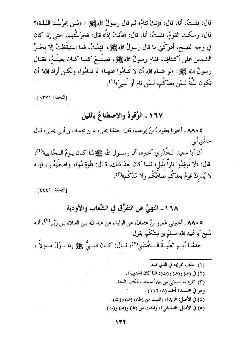 8803 - أَخْبَرَنَا سُوَيْدُ بْنُ نَصْرٍ قَالَ: أَخْبَرَنَا عَبْدُ اللهِ، عَنِ الْمَسْعُودِيِّ، عَنْ جَامِعِ بْنِ شَدَّادٍ، عَنْ عَبْدِ الرَّحْمَنِ بْنِ أَبِي عَلْقَمَةَ قَالَ: قَالَ عَبْدُ اللهِ لَمَّا رَجَعَ النَّبِيُّ صَلَّى اللهُ عَلَيْهِ وَسَلَّمَ زَمَانَ الْحُدَيْبِيَةِ قَالَ: «§مَنْ يَحْرُسُنَا اللَّيْلَةَ؟» قَالَ عَبْدُ اللهِ: أَنَا قَالَ: «إِنَّكَ تَنَامُ» ثُمَّ قَالَ رَسُولُ اللهِ صَلَّى اللهُ عَلَيْهِ وَسَلَّمَ: «مَنْ يَحْرُسُنَا اللَّيْلَةَ؟» قَالَ: فَقُلْتُ: أَنَا قَالَ: «إِنَّكَ تَنَامُ» ثُمَّ قَالَ رَسُولُ اللهِ صَلَّى اللهُ عَلَيْهِ وَسَلَّمَ: «مَنْ يَحْرُسُنَا اللَّيْلَةَ؟» قَالَ: «وَسَكَتَ الْقَوْمُ» فَقُلْتُ: أَنَا قَالَ: «فَأَنْتَ إِذًا» قَالَ: «فَحَرَسْتُهُمْ حَتَّى إِذَا كَانَ فِي وَجْهِ الصُّبْحِ أَدْرَكَنِي» مَا قَالَ رَسُولُ اللهِ صَلَّى اللهُ عَلَيْهِ وَسَلَّمَ: «فَنِمْتُ فَمَا اسْتَيْقَظْتُ إِلَّا بِحَرِّ الشَّمْسِ عَلَى أَكْتَافِنَا فَقَامَ رَسُولُ اللهِ صَلَّى اللهُ عَلَيْهِ وَسَلَّمَ فَصَنَعَ كَمَا كَانَ يَصْنَعُ» فَقَالَ رَسُولُ اللهِ صَلَّى اللهُ عَلَيْهِ وَسَلَّمَ: «لَوْ شَاءَ اللهُ أَنْ لَا تَنَامُوا عَنْهَا لَمْ تَنَامُوا، وَلَكِنْ أَرَادَ اللهُ أَنْ تَكُونَ سُنَّةً لِمَنْ بَعْدَكُمْ لِمَنْ نَامَ أَوْ نَسِيَ»
