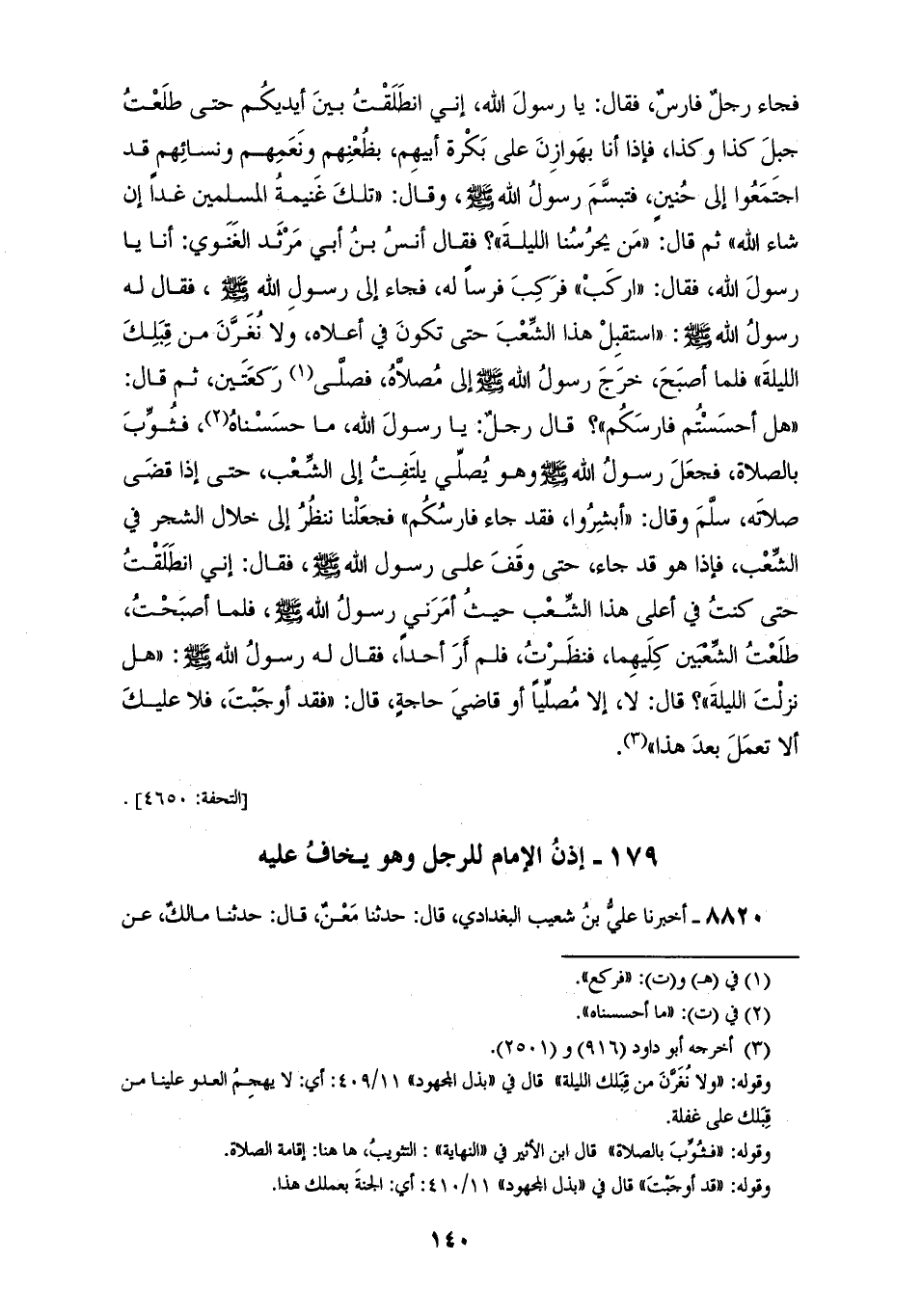 8819 - أَخْبَرَنَا مُحَمَّدُ بْنُ يَحْيَى بْنِ مُحَمَّدٍ قَالَ: حَدَّثَنَا أَبُو تَوْبَةَ قَالَ: حَدَّثَنَا مُعَاوِيَةُ بْنُ سَلَامٍ، عَنْ زَيْدِ بْنِ سَلَامٍ، أَنَّهُ سَمِعَ أَبَا سَلَامٍ قَالَ: حَدَّثَنِي السَّلُولِيُّ، أَنَّهُ حَدَّثَهُ سَهْلُ بْنُ الْحَنْظَلِيَّةِ، أَنَّهُمْ §سَافِرُوا مَعَ رَسُولِ اللهِ صَلَّى اللهُ عَلَيْهِ وَسَلَّمَ يَوْمَ حُنَيْنٍ فَأَطْنَبُوا فِي السَّيْرِ حَتَّى كَانَ عَشِيَّةُ حَضَرَتِ الصَّلَاةُ عِنْدَ رَسُولِ اللهِ صَلَّى اللهُ عَلَيْهِ وَسَلَّمَ فَجَاءَ رَجُلٌ فَارِسٌ فَقَالَ: يَا رَسُولَ اللهِ " إِنِّي انْطَلَقْتُ بَيْنَ أَيْدِيكُمْ حَتَّى طَلَعْتُ جَبَلَ كَذَا وَكَذَا، فَإِذَ أَنَا بِهَوَازِنَ عَلَى بَكْرَةِ أَبِيهِمْ بِظُعُنِهِمْ وَنَعَمِهِمْ وَنِسَائِهِمْ قَدِ اجْتَمَعُوا إِلَى حُنَيْنٍ، فَتَبَسَّمَ رَسُولُ اللهِ صَلَّى اللهُ عَلَيْهِ وَسَلَّمَ وَقَالَ: «تِلْكَ غَنِيمَةُ الْمُسْلِمِينَ غَدًا، إِنْ شَاءَ اللهُ» ثُمَّ قَالَ: «مَنْ يَحْرُسُنَا اللَّيْلَةَ؟» فَقَالَ: أَنَسُ بْنُ أَبِي مَرْثَدٍ الْغَنَوِيُّ: أَنَا يَا رَسُولَ اللهِ فَقَالَ: «ارْكَبْ، فَرَكِبَ فَرَسًا لَهُ فَجَاءَ إِلَى رَسُولِ اللهِ صَلَّى اللهُ عَلَيْهِ وَسَلَّمَ» فَقَالَ لَهُ: رَسُولُ اللهِ صَلَّى اللهُ عَلَيْهِ وَسَلَّمَ: «اسْتَقْبِلْ هَذَا الشِّعْبَ حَتَّى تَكُونَ فِي أَعْلَاهُ، وَلَا نُغَرَّنَّ مِنْ قِبَلِكَ اللَّيْلَةَ» فَلَمَّا أَصْبَحَ خَرَجَ رَسُولُ اللهِ صَلَّى اللهُ عَلَيْهِ وَسَلَّمَ إِلَى مُصَلَّاهُ فَصَلَّى رَكْعَتَيْنِ ثُمَّ قَالَ: «هَلْ أَحْسَسْتُمْ فَارِسَكُمْ؟» قَالَ رَجُلٌ: يَا رَسُولَ اللهِ، مَا حَسَسْنَاهُ، فَثُوِّبَ بِالصَّلَاةِ، فَجَعَلَ رَسُولُ اللهِ صَلَّى اللهُ عَلَيْهِ وَسَلَّمَ، وَهُوَ يُصَلِّي يَلْتَفِتُ إِلَى الشِّعْبِ حَتَّى إِذَا قَضَى صَلَاتَهُ سَلَّمَ وَقَالَ: «أَبْشِرُوا، فَقَدْ جَاءَ فَارِسُكُمْ، فَجَعَلْنَا نَنْظُرُ إِلَى خِلَالِ الشَّجَرِ فِي الشِّعْبِ، فَإِذَا هُوَ قَدْ جَاءَ حَتَّى وَقَفَ عَلَى رَسُولِ اللهِ صَلَّى اللهُ عَلَيْهِ وَسَلَّمَ» فَقَالَ: " إِنِّي انْطَلَقْتُ حَتَّى كُنْتُ فِي أَعَلَى هَذَا الشِّعْبِ حَيْثُ أَمَرَنِي رَسُولُ اللهِ صَلَّى اللهُ عَلَيْهِ وَسَلَّمَ، فَلَمَّا أَصْبَحْتُ طَلَعْتُ الشِّعْبَيْنِ كِلَيْهِمَا فَنَظَرْتُ فَلَمْ أَرَ أَحَدًا، فَقَالَ لَهُ رَسُولُ اللهِ صَلَّى اللهُ عَلَيْهِ وَسَلَّمَ: «هَلْ نَزَلَتِ اللَّيْلَةَ؟» قَالَ: لَا إِلَّا مُصَلِّيًا أَوْ قَاضيَ حَاجَةٍ قَالَ: «فَقَدْ أَوْجَبْتَ فَلَا عَلَيْكَ أَلَّا تَعْمَلَ بَعْدَ هَذَا»