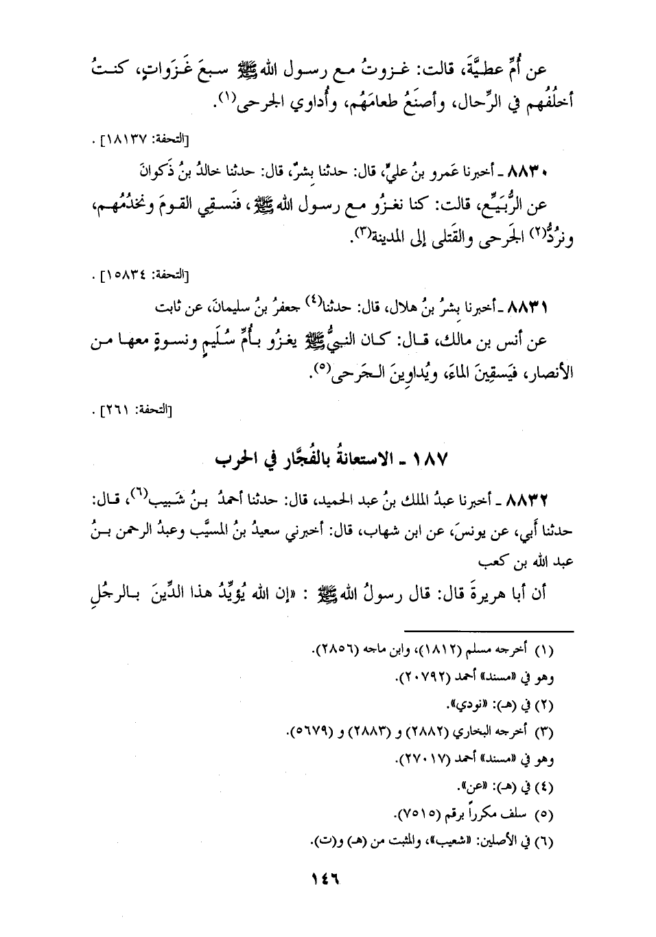 8831 - أَخْبَرَنَا بِشْرُ بْنُ هِلَالٍ قَالَ: حَدَّثَنَا جَعْفَرُ بْنُ سُلَيْمَانَ، عَنْ ثَابِتٍ، عَنْ أَنَسِ بْنِ مَالِكٍ قَالَ: §كَانَ النَّبِيُّ صَلَّى اللهُ عَلَيْهِ وَسَلَّمَ يَغْزُو بِأُمِّ سُلَيْمٍ، وَنِسْوَةٍ مَعَهَا مِنَ الْأَنْصَارِ فَيَسْقِينَ الْمَاءَ وَيُدَاوِينَ الْجَرْحَى "