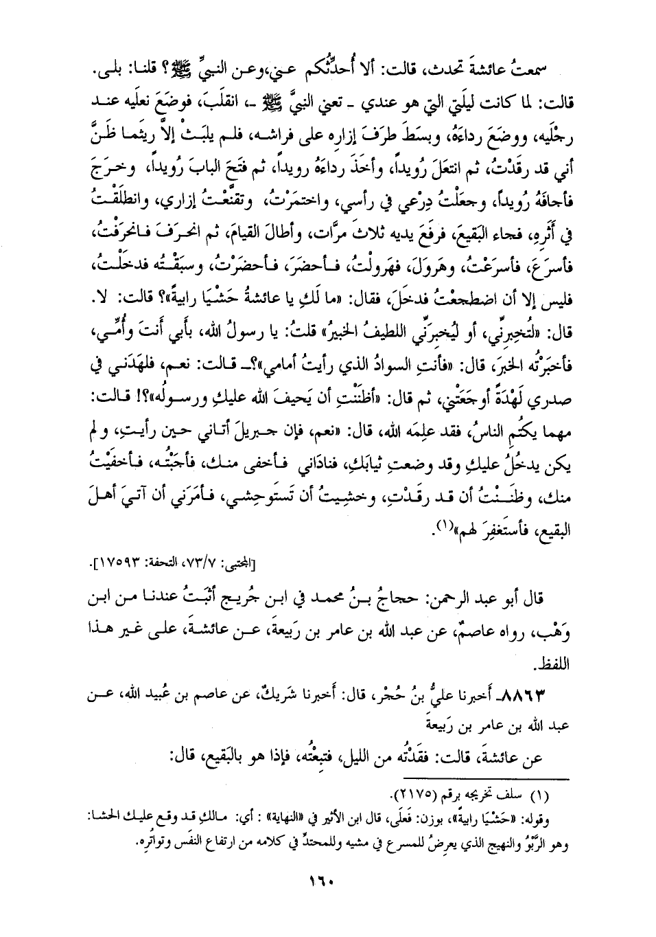 8862 - أَخْبَرَنَا يُوسُفُ بْنُ سَعِيدُ بْنُ مُسْلِمٍ الْمِصِّيصِيُّ قَالَ: حَدَّثَنَا حَجَّاجٌ، عَنِ ابْنِ جُرَيْجٍ قَالَ: أَخْبَرَنِي عَبْدُ اللهِ بْنُ أَبِي مُلَيْكَةَ، أَنَّهُ سَمِعَ مُحَمَّدَ بْنَ قَيْسِ بْنِ مَخْرَمَةَ يَقُولُ: سَمِعْتُ عَائِشَةَ، تُحَدِّثُ قَالَتْ: «§أَلَا أُحَدِّثَكُمْ عَنِّي وَعَنِ النَّبِيِّ صَلَّى اللهُ عَلَيْهِ وَسَلَّمَ؟» قُلْنَا: بَلَى قَالَتْ: «لَمَّا كَانَتْ لَيْلَتِي الَّتِي هُوَ عِنْدِي تَعْنِي النَّبِيَّ صَلَّى اللهُ عَلَيْهِ وَسَلَّمَ انْقَلَبَ، فَوَضَعَ نَعْلَيْهِ عِنْدَ رِجْلَيْهِ، وَوَضَعَ رِدَاءَهُ، وَبَسَطَ طَرَفَ إِزَارِهِ عَلَى فِرَاشِهِ، فَلَمْ يَلْبَثْ إِلَّا رَيْثَمَا ظَنَّ أَنِّي قَدْ رَقَدْتُ، ثُمَّ انْتَعَلَ رُوَيْدًا، وَأَخَذَ رِدَاءَهُ رُوَيْدًا، ثُمَّ فَتَحَ الْبَابَ رُوَيْدًا، وَخَرَجَ فَأَجَافَهُ رُوَيْدًا، وَجَعَلْتُ دِرْعِي فِي رَأْسِي، وَاخْتَمَرْتُ، وَتَقَنَّعْتُ إِزَارِي، وَانْطَلَقْتُ فِي أَثَرِهِ، فَجَاءَ الْبَقِيعَ فَرَفَعَ يَدَيْهِ ثَلَاثَ مَرَّاتٍ وَأَطَالَ الْقِيَامَ، ثُمَّ انْحَرَفَ، فَانْحَرَفْتُ، فَأَسْرَعَ فَأَسْرَعْتُ، وَهَرْوَلَ فَهَرْوَلْتُ، فَأَحْضَرَ فَأَحْضَرْتُ، وَسَبَقْتُهُ فَدَخَلْتُ، فَلَيْسَ إِلَّا أَنِ اضْطَجَعْتُ فَدَخَلَ» فَقَالَ: مَا لَكِ يَا عَائِشُةُ حَشْيَا رَابِيَةً؟ قَالَتْ: «لَا» قَالَ: لَتُخْبِرِنِّي، أَوْ لَيُخْبِرَنِّي اللَّطِيفُ الْخَبِيرُ قُلْتُ: يَا رَسُولَ اللهِ «بِأَبِي أَنْتَ وَأُمِّي فَأَخْبَرْتُهُ الْخَبَرَ» قَالَ: فَأَنْتِ السَّوَادُ الَّذِي رَأَيْتُ أَمَامِي قَالَتْ: «نَعَمْ، فَلَهَدَنِي فِي صَدْرِي لَهْدَةً أَوْجَعَتْنِي» ثُمَّ قَالَ: «أَظَنَنْتِ أَنْ يَحِيفَ اللهُ عَلَيْكِ وَرَسُولُهُ» قَالَتْ: مَهْمَا يَكْتُمُ النَّاسُ فَقَدْ عَلِمَهُ اللهُ قَالَ: «نَعَمْ، فَإِنَّ جِبْرِيلَ أَتَانِي حِينَ رَأَيْتُ، وَلَمْ يَكُنْ يَدْخُلُ عَلَيْكِ، وَقَدْ وَضَعْتِ ثِيَابَكِ، فَنَادَانِي فَأَخْفَى مِنْكِ، فَأَجَبْتُهُ فَأَخْفَيْتُ مِنْكِ، وَظَنَنْتُ أَنْ قَدْ رَقَدْتِ، وَخَشِيتُ أَنْ تَسْتَوْحِشِي، فَأَمَرَنِي أَنْ آتِيَ أَهْلَ الْبَقِيعِ فأسْتَغْفِرَ لَهُمْ» قَالَ أَبُو عَبْدِ الرَّحْمَنِ: حَجَّاجُ بْنُ مُحَمَّدٍ فِي ابْنِ جُرَيْجٍ أَثْبَتُ عِنْدَنَا مِنَ ابْنِ وَهْبٍ، رِوَاهُ عَاصِمٌ عَنْ عَبْدِ اللهِ بْنِ عَامِرِ بْنِ رَبِيعَةَ عَنْ عَائِشَةَ عَلَى غَيْرِ هَذَا اللَّفْظِ
