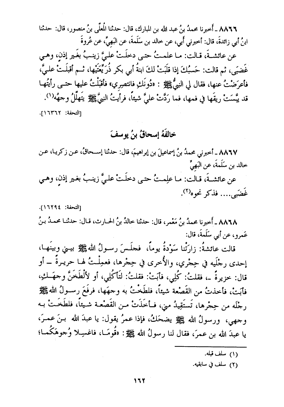 8867 - أَخْبَرَنِي مُحَمَّدُ بْنُ إِسْمَاعِيلَ بْنِ إِبْرَاهِيمَ قَالَ: حَدَّثَنَا إِسْحَاقُ، عَنْ زَكَرِيَّا، عَنْ خَالِدِ بْنِ سَلَمَةَ، عَنِ الْبَهِيِّ، عَنْ عَائِشَةَ قَالَتْ: مَا عَلِمْتُ حَتَّى دَخَلَتْ عَلَيَّ زَيْنَبُ بِغَيْرِ إِذْنٍ وَهِيَ غَضْبَى. . . . . . . فَذَكَرَ نَحْوَهُ