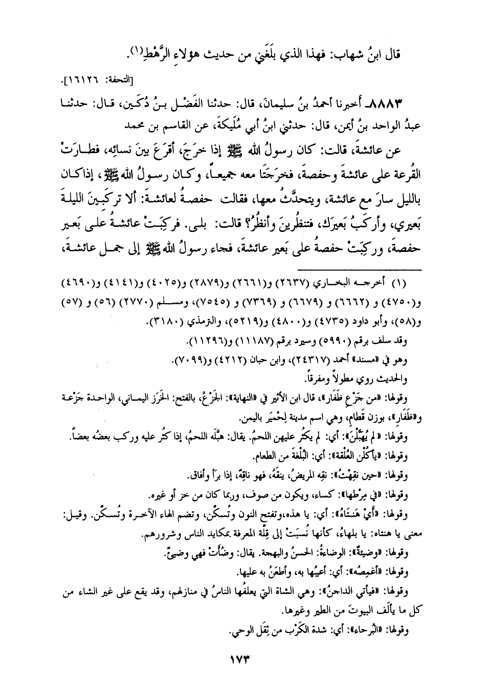 8883 - أَخْبَرَنَا أَحْمَدُ بْنُ سُلَيْمَانَ قَالَ: حَدَّثَنَا الْفَضْلُ بْنُ دُكَيْنٍ قَالَ: حَدَّثَنَا عَبْدُ الْوَاحِدِ بْنُ أَيْمَنْ قَالَ: حَدَّثَنِي ابْنُ أَبِي مُلَيْكَةَ، عَنِ الْقَاسِمِ بْنِ مُحَمَّدٍ، عَنْ عَائِشَةَ قَالَتْ: §كَانَ رَسُولُ اللهِ صَلَّى اللهُ عَلَيْهِ وَسَلَّمَ إِذَا خَرَجَ أَقْرَعَ بَيْنَ نِسَائِهِ فَطَارَتِ الْقُرْعَةُ عَلَى عَائِشَةِ وَحَفْصَةَ فَخَرَجَتَا مَعَهُ جَمِيعًا، وَكَانَ رَسُولُ اللهِ صَلَّى اللهُ عَلَيْهِ وَسَلَّمَ إِذَا كَانَ بِاللَّيْلِ سَارَ مَعَ عَائِشَةَ وَيَتَحَدَّثُ مَعَهَا، فَقَالَتْ حَفْصَةُ لِعَائِشَةَ: أَلَا تَرْكَبِينَ اللَّيْلَةَ بَعِيرِي، وَأَرْكَبُ بَعِيرَكِ فَتَنْظُرِينَ وَأَنْظُرُ؟ قَالَتْ: «بَلَى، فَرَكِبَتْ عَائِشَةُ عَلَى بَعِيرِ حَفْصَةَ، وَرَكِبَتْ حَفْصَةُ عَلَى بَعِيرِ عَائِشَةَ، فَجَاءَ رَسُولُ اللهِ صَلَّى اللهُ عَلَيْهِ وَسَلَّمَ إِلَى جَمَلِ عَائِشَةَ، وَعَلَيْهِ حَفْصَةُ فَسَلَّمَ عَلَيْهَا، ثُمَّ سَارَ مَعَهَا حَتَّى نَزَلُوا، وَافْتَقَدَتْهُ عَائِشَةُ فَغَارَتْ، فَلَمَّا نَزَلَتْ جَعَلَتْ تَجْعَلُ رِجْلَيْهَا بَيْنَ الْإِذْخِرِ» وَتَقُولُ: «يَا رَبِّ سَلِّطْ عَلَيَّ عَقْرَبًا أَوْ حَيَّةً تَلْدَغُنِي عَنْ رَسُولِكَ صَلَّى اللهُ عَلَيْهِ وَسَلَّمَ، فَلَا أَسْتَطِيعُ أَنْ أَقُولَ لَهُ شَيْئًا»
