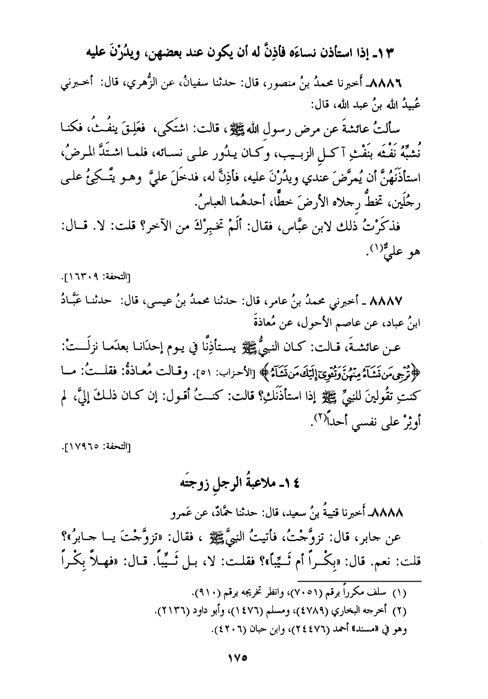 8887 - أَخْبَرَنِي مُحَمَّدُ بْنُ عَامِرٍ قَالَ: حَدَّثَنَا مُحَمَّدُ بْنُ عِيسَى قَالَ: حَدَّثَنَا عَبَّادُ بْنُ عَبَّادٍ، عَنْ عَاصِمٍ الْأَحْوَلِ، عَنْ مُعَاذَةَ، عَنْ عَائِشَةَ قَالَتْ: §كَانَ النَّبِيُّ صَلَّى اللهُ عَلَيْهِ وَسَلَّمَ يَسْتَأْذِنَّا فِي يَوْمِ إِحْدَانَا بَعْدَمَا نَزَلَتْ {تُرْجِي مَنْ تَشَاءُ مِنْهُنَّ، وَتُؤْوِي إِلَيْكَ مَنْ تَشَاءُ} [الأحزاب: 51] وَقَالَتْ مُعَاذَةُ فَقُلْتُ: مَا كُنْتِ تَقُولِينَ لِلنَّبِيِّ صَلَّى اللهُ عَلَيْهِ وَسَلَّمَ إِذَا اسْتَأْذَنَكِ؟ قَالَتْ: كُنْتُ أَقُولُ: «إِنْ كَانَ ذَلِكَ إِلَيَّ لَمْ أُوثِرْ عَلَى نَفْسِي أَحَدًا»