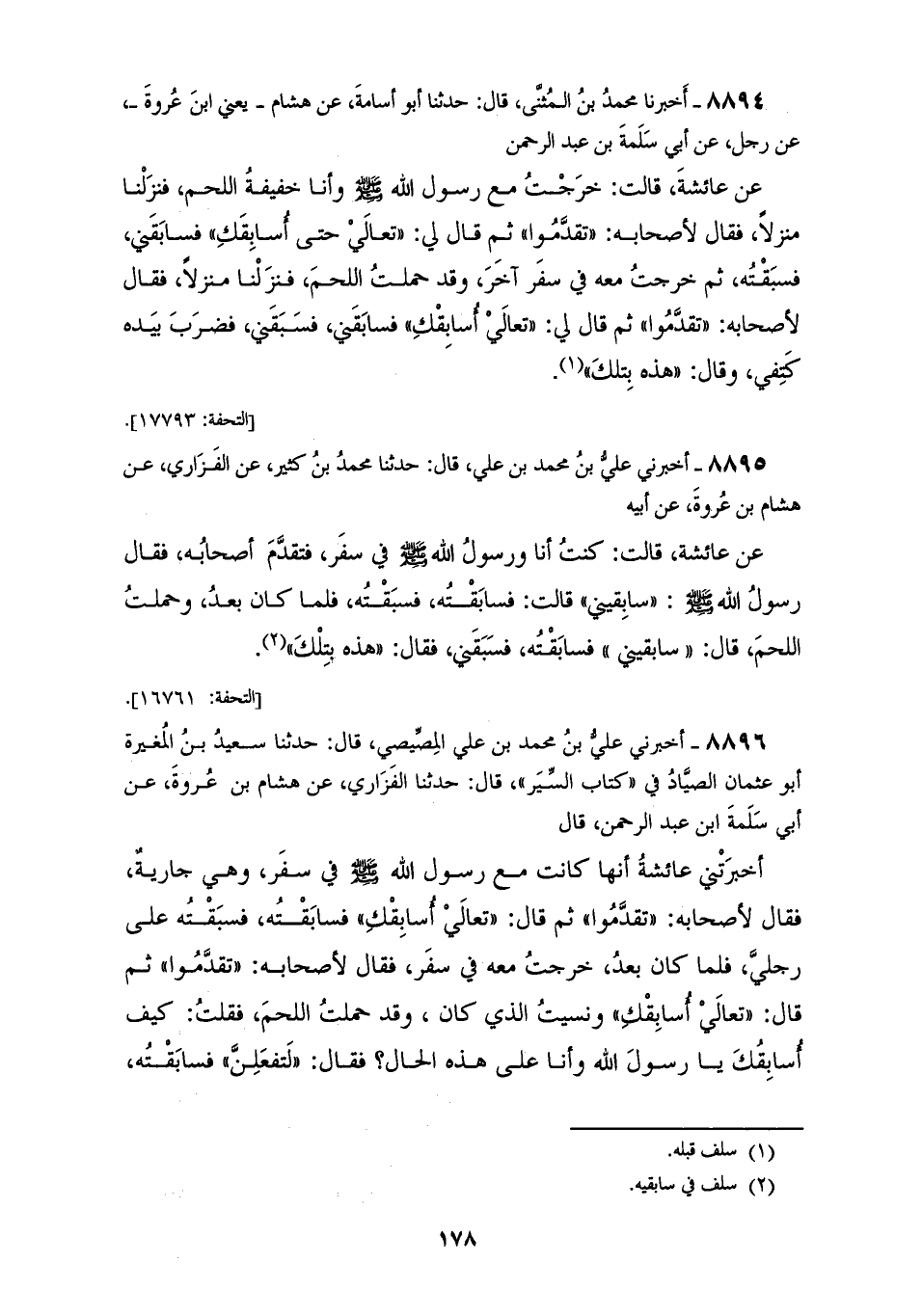 8896 - أَخْبَرَنِي عَلِيُّ بْنُ مُحَمَّدِ بْنِ عَلِيٍّ الْمِصِّيصِيُّ قَالَ: حَدَّثَنَا سَعِيدُ بْنُ الْمُغِيرَةِ أَبُو عُثْمَانَ الصَّيَّادُ، فِي كِتَابِ السِّيَرِ قَالَ: حَدَّثَنَا الْفَزَارِيُّ، عَنْ هِشَامِ بْنِ عُرْوَةَ، عَنْ أَبِي سَلَمَةَ بْنِ عَبْدِ الرَّحْمَنِ قَالَ: أَخْبَرْتِنِي عَائِشَةُ، أَنَّهَا كَانَتْ مَعَ رَسُولِ اللهِ صَلَّى اللهُ عَلَيْهِ وَسَلَّمَ §فِي سَفَرٍ وَهِيَ جَارِيَةٌ فَقَالَ لِأَصْحَابِهِ: «تَقَدَّمُوا» ثُمَّ قَالَ: «تَعَالَيْ أُسَابِقْكِ، فَسَابَقْتُهُ فَسَبَقْتُهُ عَلَى رِجْلِي، فَلَمَّا كَانَ بَعْدُ خَرَجْتُ مَعَهُ فِي سَفَرٍ» فَقَالَ لِأَصْحَابِهِ: «تَقَدَّمُوا» ثُمَّ قَالَ: «تَعَالَيْ أُسَابِقْكِ» وَنَسِيتُ الَّذِي كَانَ وَقَدْ حَمَلْتُ اللَّحْمَ فَقُلْتُ: كَيْفَ أُسَابِقُكَ يَا رَسُولَ اللهِ وَأَنَا عَلَى هَذِهِ الْحَالِ؟ فَقَالَ: «لَتَفْعَلِنَّ، فَسَابَقْتُهُ فَسَبَقَنِي» فَقَالَ: «هَذِهِ بِتِلْكَ السَّبْقَةِ»