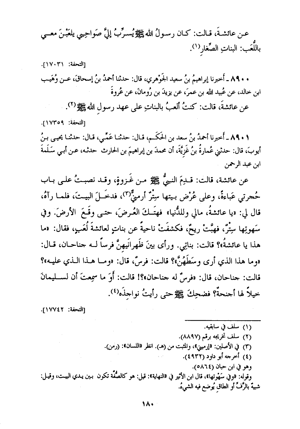 8901 - أَخْبَرَنَا أَحْمَدُ بْنُ سَعْدِ بْنِ الْحَكَمِ قَالَ: حَدَّثَنَا عَمِّي قَالَ: حَدَّثَنَا يَحْيَى بْنُ أَيُّوبَ قَالَ: حَدَّثَنِي عُمَارَةُ بْنُ غَزِيَّةَ، أَنَّ مُحَمَّدَ بْنَ إِبْرَاهِيمَ بْنِ الْحَارِثِ، حَدَّثَهُ عَنْ أَبِي سَلَمَةَ بْنِ عَبْدِ الرَّحْمَنِ، عَنْ عَائِشَةَ قَالَتْ: قَدِمَ النَّبِيُّ صَلَّى اللهُ عَلَيْهِ وَسَلَّمَ مِنْ غَزْوَةٍ، وَقَدْ نَصَبْتُ عَلَى بَابِ حُجْرَتِي عَبَاءَةً، وَعَلَى عُرْضِ بَيْتِهَا سِتْرٌ أَرْمَنِّيٌّ، فَدَخَلَ الْبَيْتَ، فَلَمَّا رَآهُ قَالَ لِي: يَا عَائِشَةُ «مَا لِي وَلِلدُّنْيَا؟ فَهَتَكَ الْعُرْضَ حَتَّى وَقَعَ الْأَرْضَ، وَفِي سَهْوَتِهَا سِتْرٌ، فَهَبَّتْ رِيحٌ، فَكَشَفَتْ نَاحِيَةً عَنْ بَنَاتٍ لِعَائِشَةَ لَعَبٍ» فَقَالَ: «§مَا هَذَا يَا عَائِشَةُ؟» قَالَتْ: بَنَاتِي، وَرَأَى بَيْنَ ظَهْرَانِيهِنَّ فَرَسٌ لَهُ جَنَاحَانِ، قَالَ: «وَمَا هَذَا الَّذِي أَرَى وَسَطَهُنَّ؟» قَالَتْ: فَرَسٌ، قَالَ: «وَمَا هَذَا الَّذِي عَلَيْهِ؟» قَالَتْ: جَنَاحَانِ، قَالَ: «فَرَسٌ لَهُ جَنَاحَانِ؟» قَالَتْ: «أَوَ مَا سَمِعْتَ أَنَّ لِسُلَيْمَانَ خَيْلًا لَهَا أَجْنِحَةٌ، فَضَحِكَ صَلَّى اللهُ عَلَيْهِ وَسَلَّمَ حَتَّى رَأَيْتُ نَوَاجِذَهُ»