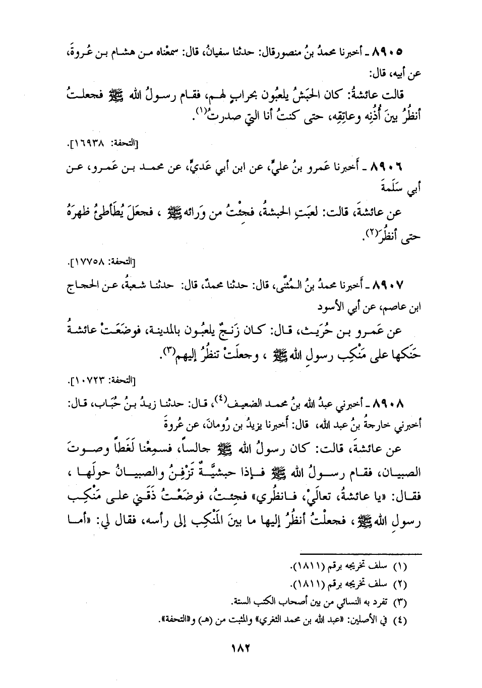 8905 - أَخْبَرَنَا مُحَمَّدُ بْنُ مَنْصُورٍ قَالَ: حَدَّثَنَا سُفْيَانُ قَالَ: سَمِعْنَاهُ مِنْ هِشَامِ بْنِ عُرْوَةَ عَنْ أَبِيهِ قَالَ: قَالَتْ عَائِشَةُ: §كَانَ الْحَبَشُ يَلْعَبُونَ بِحِرَابٍ لَهُمْ، فَقَامَ رَسُولُ اللهِ صَلَّى اللهُ عَلَيْهِ وَسَلَّمَ، فَجَعَلْتُ أَنْظُرُ بَيْنَ أُذُنِهِ وَعَاتِقِهِ حَتَّى كُنْتُ أَنَا الَّتِي صَدَرْتُ "