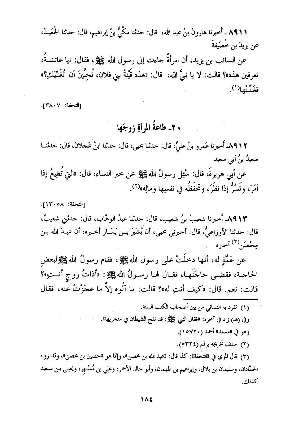 8913 - أَخْبَرَنَا شُعَيْبُ بْنُ شُعَيْبٍ قَالَ: حَدَّثَنَا عَبْدُ الْوَهَّابِ قَالَ: حَدَّثَنِي شُعَيْبٌ قَالَ: حَدَّثَنَا الْأَوْزَاعِيُّ قَالَ: أَخْبَرَنِي يَحْيَى، أَنَّ بُشَيْرَ بْنَ يَسَارٍ، أَخْبَرَهُ أَنَّ عَبْدَ اللهِ بْنَ مِحْصَنٍ أَخْبَرَهُ عَنْ عَمَّةٍ لَهُ أَنَّهَا §دَخَلَتْ عَلَى رَسُولِ اللهِ صَلَّى اللهُ عَلَيْهِ وَسَلَّمَ فَقَامَ رَسُولُ اللهِ صَلَّى اللهُ عَلَيْهِ وَسَلَّمَ لِبَعْضِ الْحَاجَةِ فَقَضَى حَاجَتَهَا فَقَالَ لَهَا رَسُولُ اللهِ صَلَّى اللهُ عَلَيْهِ وَسَلَّمَ: «أَذَاتُ زَوْجٍ أَنْتِ؟» قَالَتْ: نَعَمْ قَالَ: «كَيْفَ أَنْتِ لَهُ؟» قَالَتْ: مَا آلُوهُ، إِلَّا مَا عَجَزْتُ عَنْهُ فَقَالَ رَسُولُ اللهِ صَلَّى اللهُ عَلَيْهِ وَسَلَّمَ: «انْظُرِي أَيْنَ أَنْتِ مِنْهُ، فَإِنَّهُ جَنَّتُكِ وَنَارُكِ»