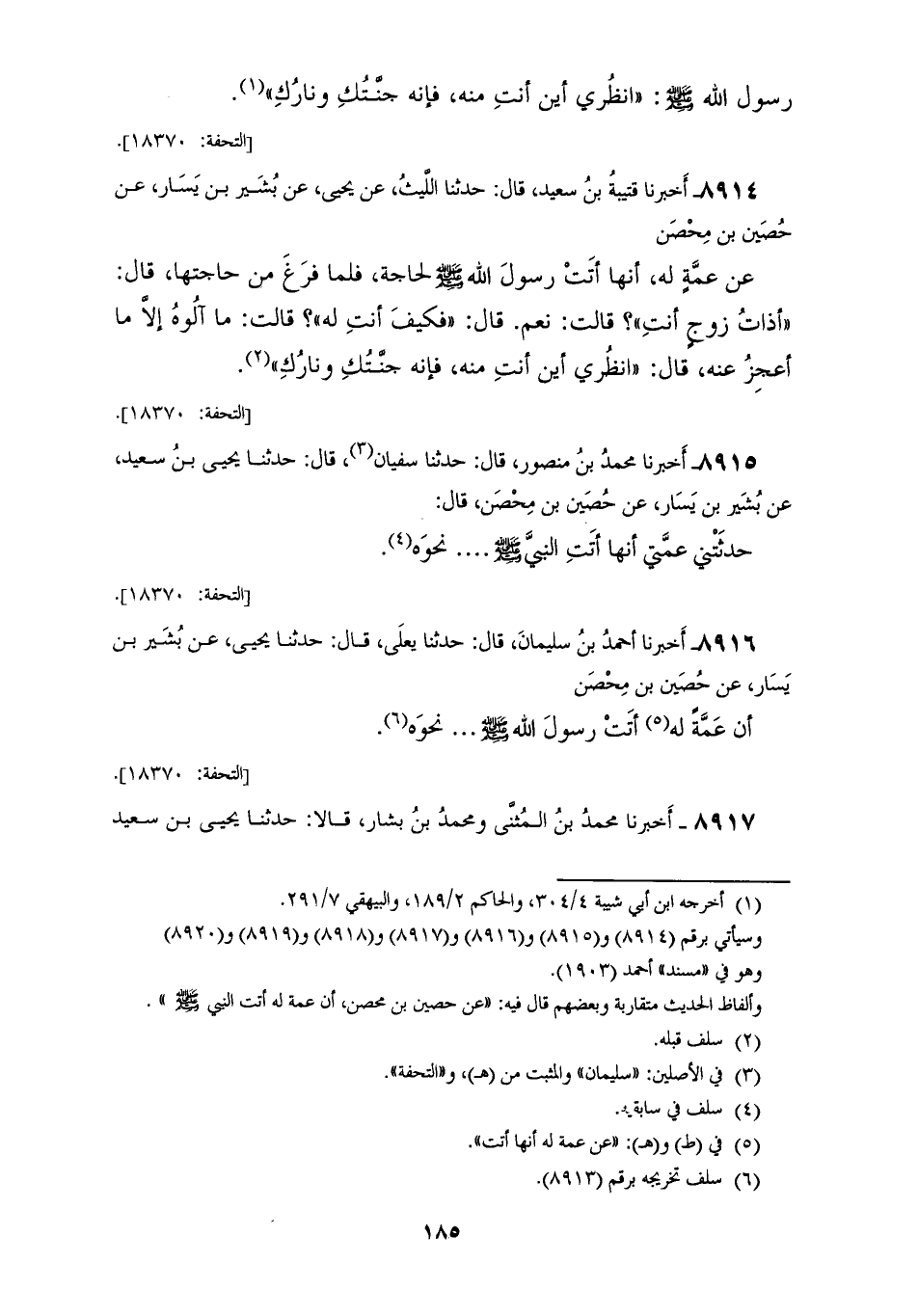 8918 - أَخْبَرَنَا أَحْمَدُ بْنُ سُلَيْمَانَ قَالَ: حَدَّثَنَا يَزِيدُ قَالَ: أَخْبَرَنَا يَحْيَى بْنُ سَعِيدٍ أَنَّ بُشَيْرَ بْنَ يَسَارٍ، أَخْبَرَهُ عَنْ حُصَيْنِ بْنِ مِحْصَنٍ، أَنَّ عَمَّةً، لَهُ أَتَتِ النَّبِيَّ صَلَّى اللهُ عَلَيْهِ وَسَلَّمَ نَحْوَهُ
