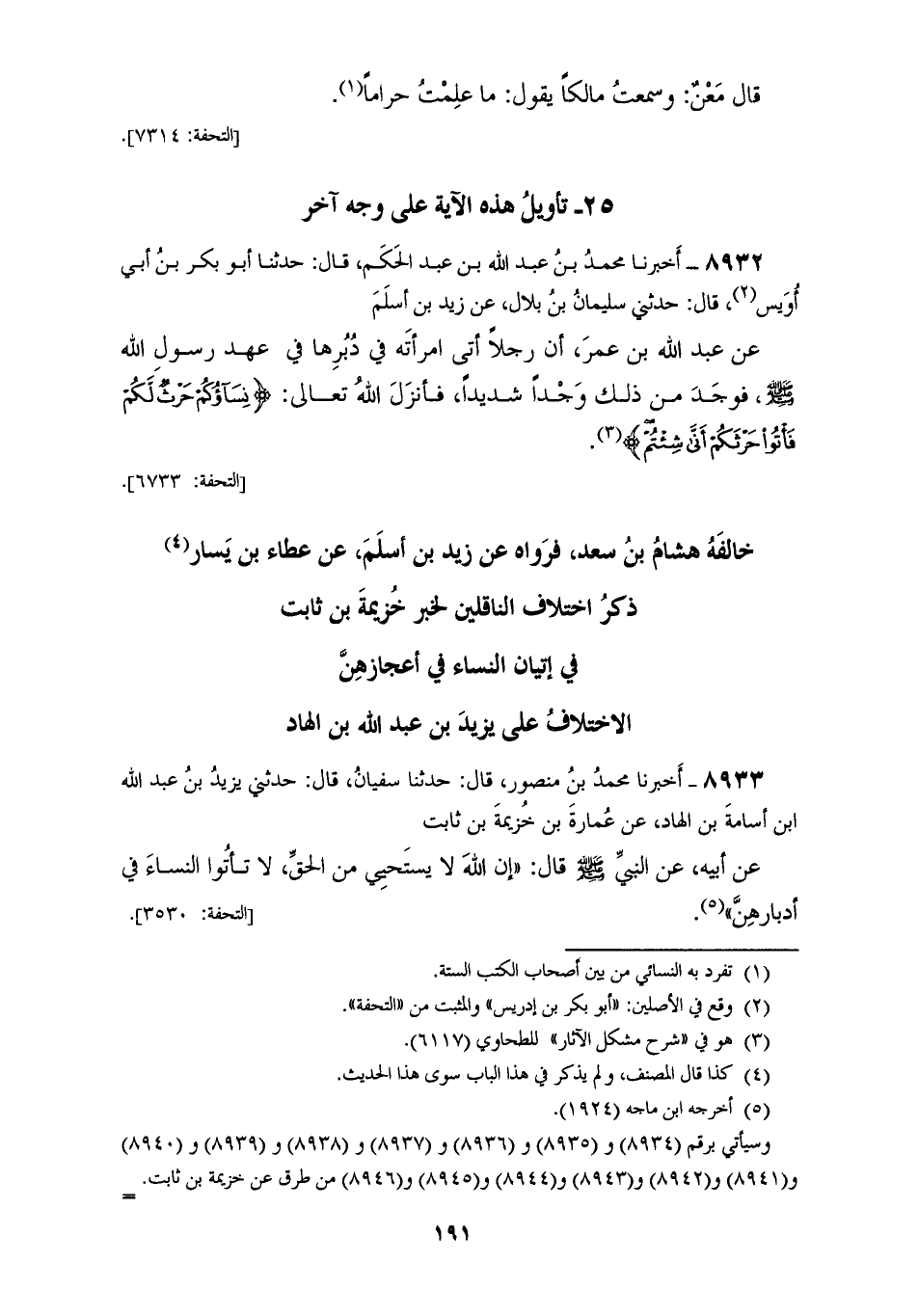 8933 - أَخْبَرَنَا مُحَمَّدُ بْنُ مَنْصُورٍ قَالَ: حَدَّثَنَا سُفْيَانُ قَالَ: حَدَّثَنِي يَزِيدُ بْنُ عَبْدِ اللهِ بْنِ أُسَامَةَ بْنِ الْهَادِ، عَنْ عُمَارَةَ بْنِ خُزَيْمَةَ بْنِ ثَابِتٍ، عَنْ أَبِيهِ، عَنِ النَّبِيِّ صَلَّى اللهُ عَلَيْهِ وَسَلَّمَ قَالَ: «§إِنَّ اللهَ لَا يَسْتَحِيي مِنَ الْحَقِّ لَا تَأْتُوا النِّسَاءَ فِي أَدْبَارِهِنَّ»