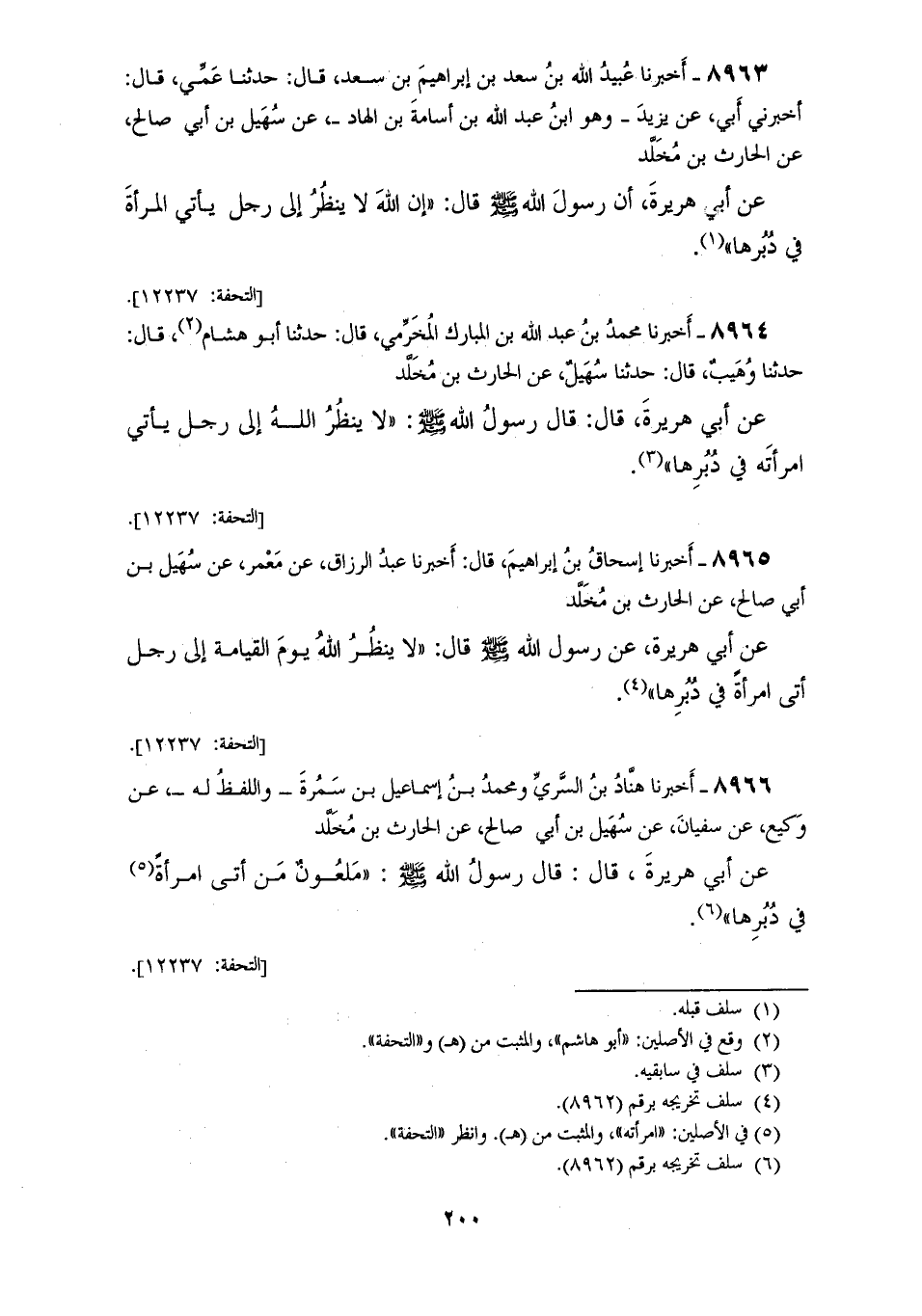 8964 - أَخْبَرَنَا مُحَمَّدُ بْنُ عَبْدِ اللهِ بْنِ الْمُبَارَكِ الْمَخْرَمِيُّ قَالَ: حَدَّثَنَا أَبُو هِشَامٍ قَالَ: حَدَّثَنَا وُهَيْبٌ قَالَ: حَدَّثَنَا سُهَيْلٌ، عَنِ الْحَارِثِ بْنِ مَخْلَدٍ، عَنْ أَبِي هُرَيْرَةَ قَالَ: قَالَ رَسُولُ اللهِ صَلَّى اللهُ عَلَيْهِ وَسَلَّمَ: «§لَا يَنْظُرُ اللهُ إِلَى رَجُلٍ يَأْتِي امْرَأَتَهُ فِي دُبُرِهَا»