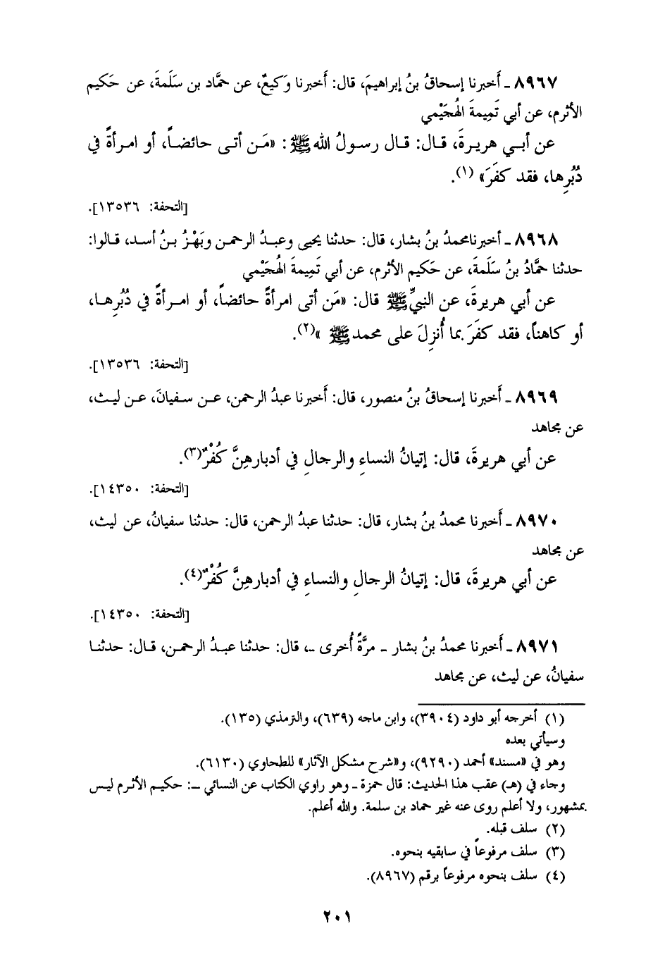 8968 - أَخْبَرَنَا مُحَمَّدُ بْنُ بَشَّارٍ قَالَ: حَدَّثَنَا يَحْيَى، وَعَبْدُ الرَّحْمَنِ، وَبَهْزُ بْنُ أَسَدٍ قَالُوا: حَدَّثَنَا حَمَّادُ بْنُ سَلَمَةَ، عَنْ حَكِيمٍ الْأَثْرَمِ، عَنْ أَبِي تَمِيمَةَ الْهُجَيْمِيِّ، عَنْ أَبِي هُرَيْرَةَ، عَنِ النَّبِيِّ صَلَّى اللهُ عَلَيْهِ وَسَلَّمَ قَالَ: «§مَنْ أَتَى امْرَأَةً حَائِضًا، أَوِ امْرَأَةً فِي دُبُرِهَا، أَوْ كَاهِنًا فَقَدْ كَفَرَ بِمَا أُنْزِلَ عَلَى مُحَمَّدٍ صَلَّى اللهُ عَلَيْهِ وَسَلَّمَ»