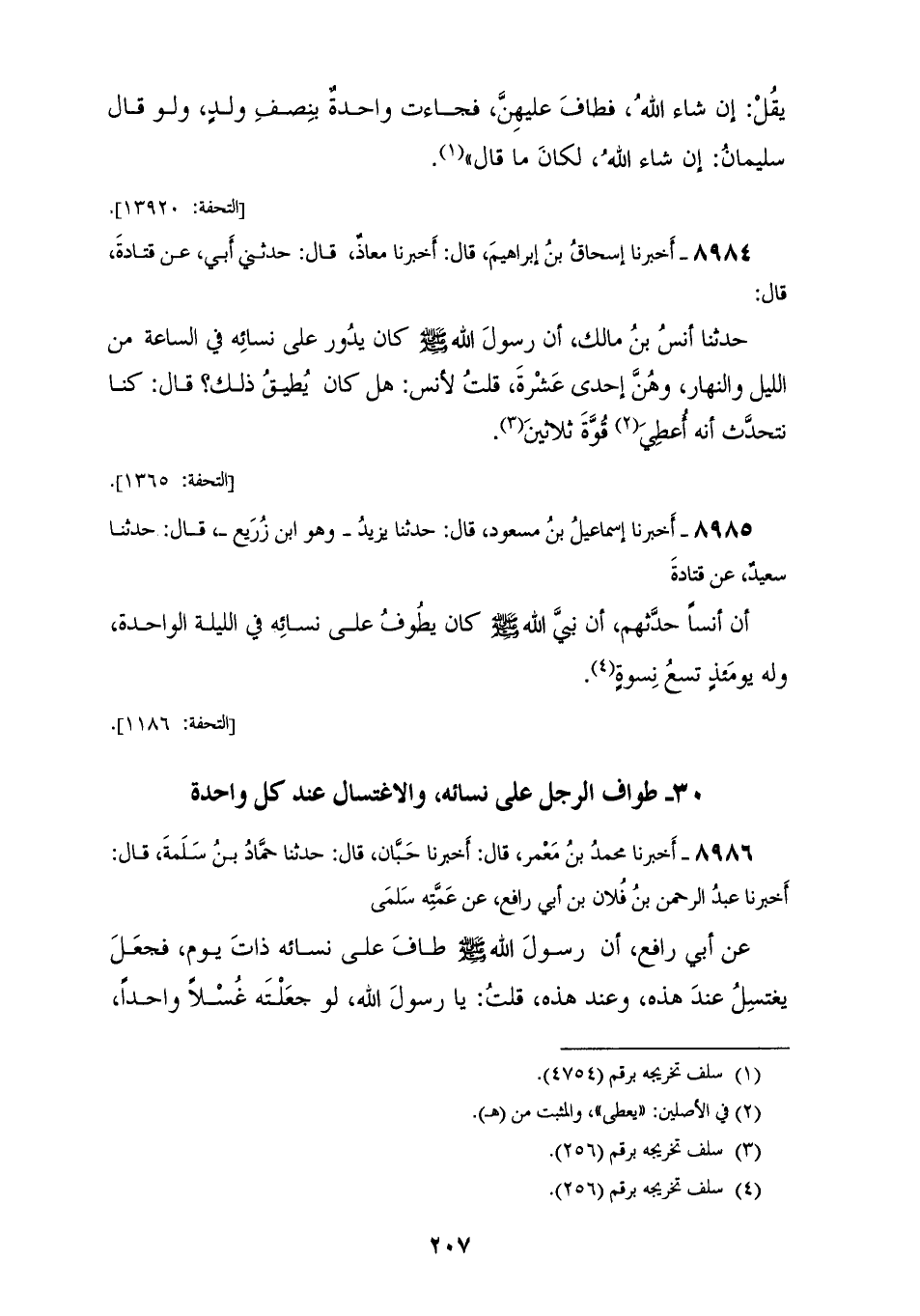 8984 - أَخْبَرَنَا إِسْحَاقُ بْنُ إِبْرَاهِيمَ قَالَ: أَخْبَرَنَا مُعَاذٌ قَالَ: حَدَّثَنِي أَبِي، عَنْ قَتَادَةَ قَالَ: حَدَّثَنَا أَنَسُ بْنُ مَالِكٍ، أَنَّ رَسُولَ اللهِ صَلَّى اللهُ عَلَيْهِ وَسَلَّمَ كَانَ §يَدُورُ عَلَى نِسَائِهِ فِي السَّاعَةِ مِنَ اللَّيْلِ وَالنَّهَارِ، وَهُنَّ إِحْدَى عَشْرَةَ قُلْتُ لِأَنَسٍ: «هَلْ كَانَ يُطِيقُ ذَلِكَ؟» قَالَ: «كُنَّا نَتَحَدَّثُ أَنَّهُ أُعْطِيَ قُوَّةَ ثَلَاثِينَ»