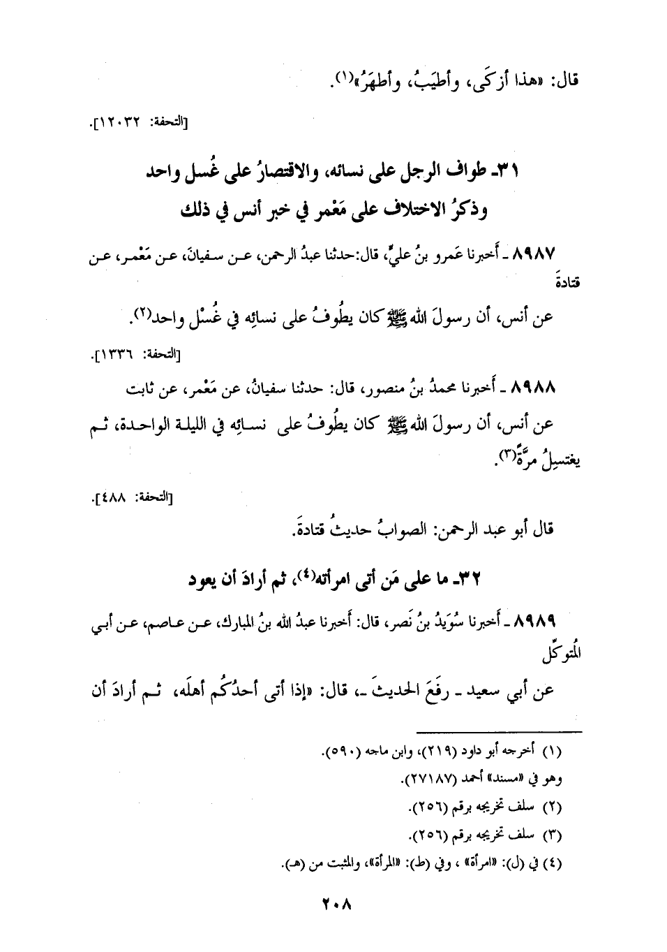 8987 - أَخْبَرَنَا عَمْرُو بْنُ عَلِيٍّ قَالَ: حَدَّثَنَا عَبْدُ الرَّحْمَنِ، عَنْ سُفْيَانَ، عَنْ مَعْمَرٍ، عَنْ قَتَادَةَ، عَنْ أَنَسٍ، أَنَّ رَسُولَ اللهِ صَلَّى اللهُ عَلَيْهِ وَسَلَّمَ «§كَانَ يَطُوفُ عَلَى نِسَائِهِ فِي غُسْلٍ وَاحِدٍ»